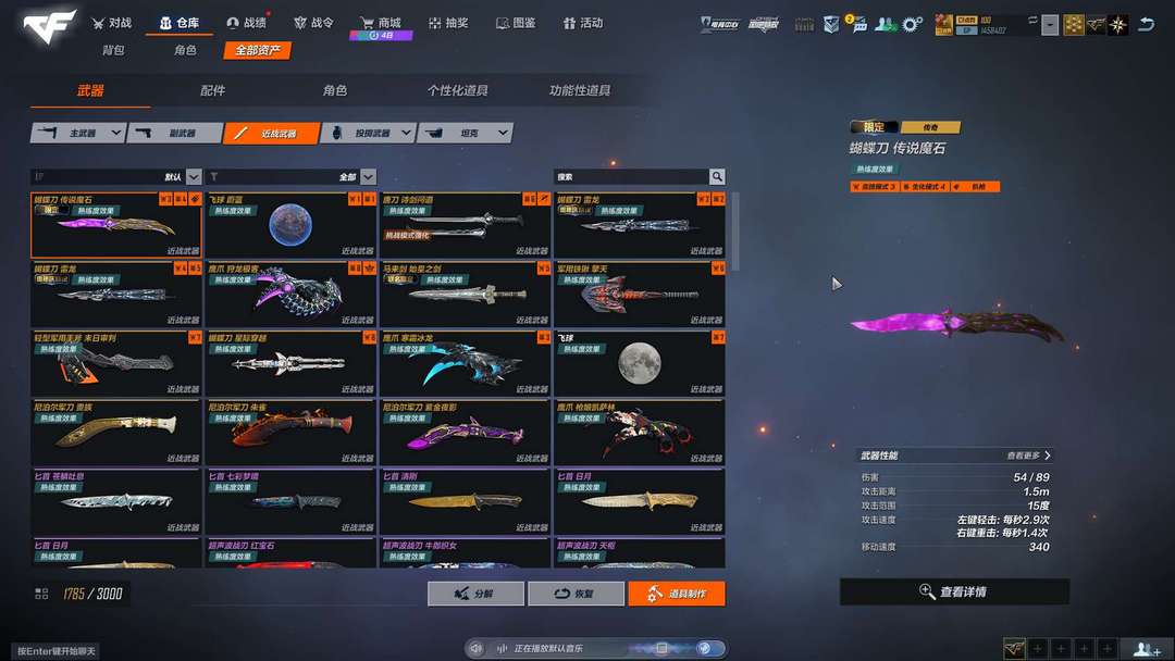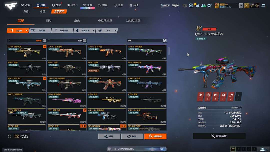 装备描述:什么模式都可以玩,各类热门武器都有皮肤,投掷物也有好几套金皮,蝴蝶刀 192 加特林有炫彩