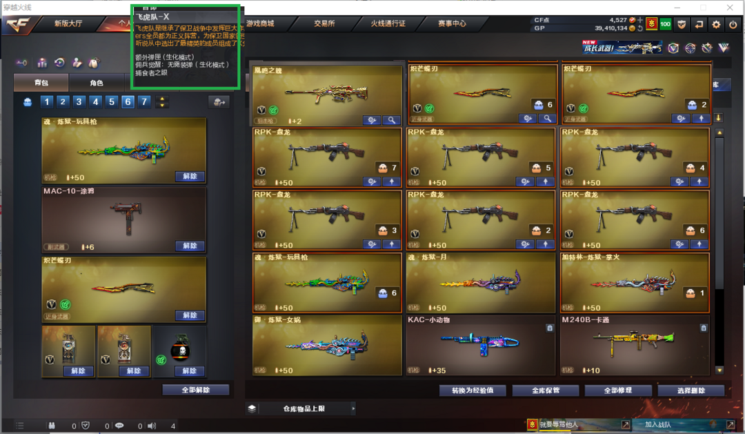 装备描述:排位:可以、、、、、、、、生化全装:(查看生化僵尸血量):无需换弹、6盘龙、炼狱、MAC涂鸦、2把炽芒蝶刃、生化雷、超级对讲机、全部弹匣、、、、、、、爆破四防:幻神音效(宠儿、冠军之幻)、、、USP雷暴、柯尔特竞技荣光、传说梦魇、白虎、王者雷怒、凤鸣之魄、、、幻神音效、蔷薇音效、、、1套夜魔、1套幻灵、1套竞技荣光、1套神工天巧、、、、生化人物(飞虎队)、爆破四防(云悠悠、晴雅、鹰)