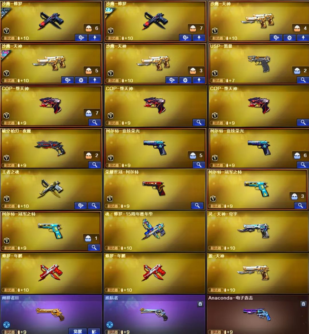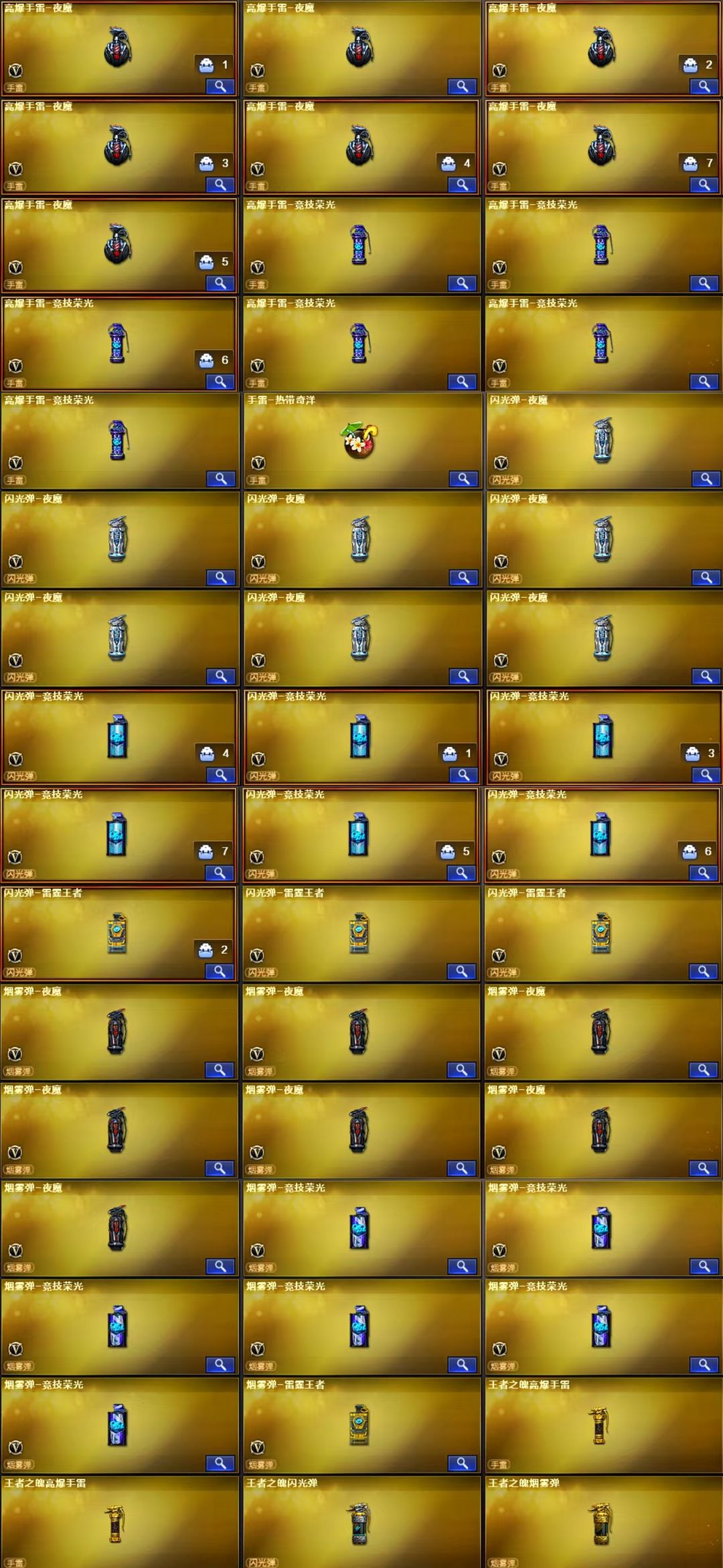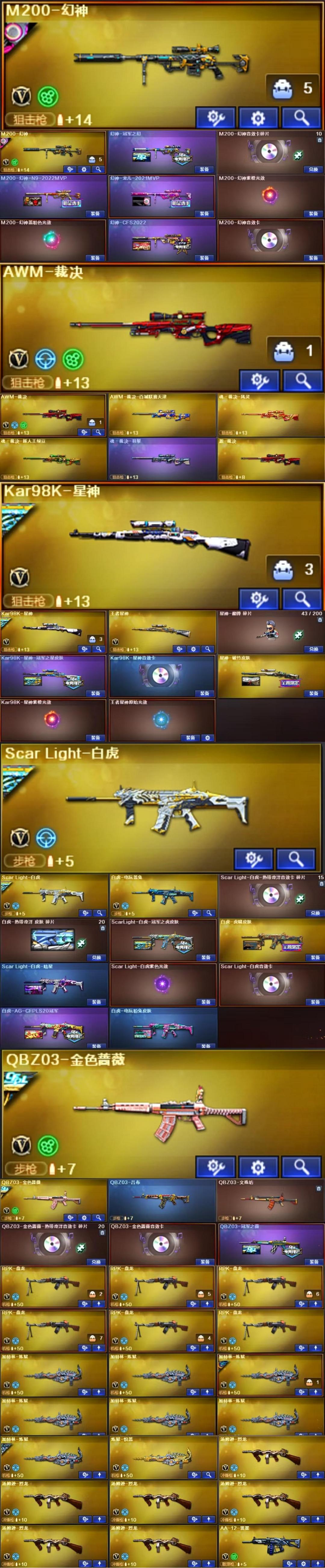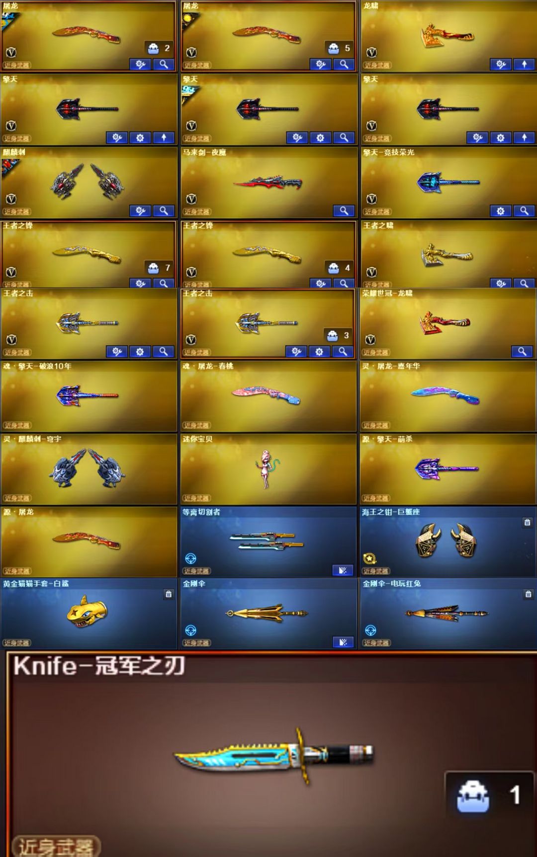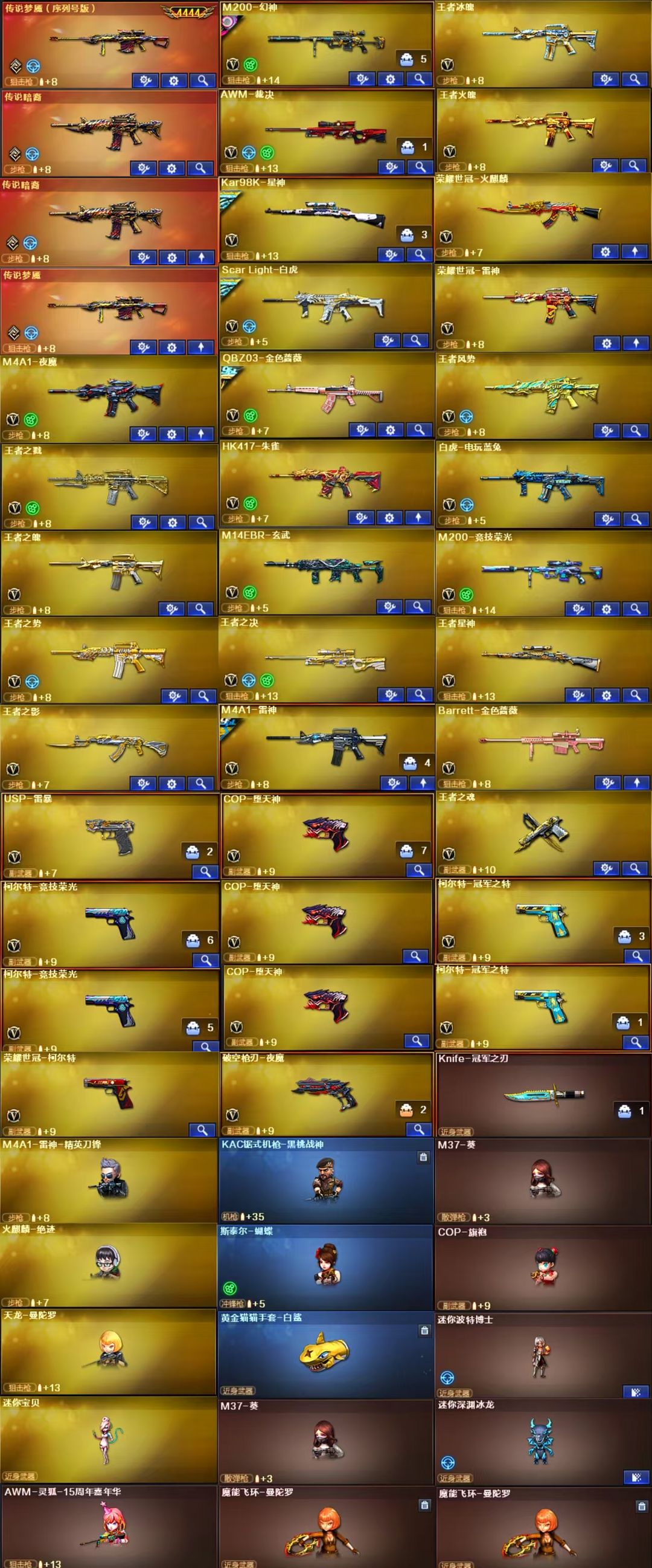 装备描述:王者武器:烟雾弹-雷霆王者-觉醒版;闪光弹-雷霆王者-觉醒版;王者之势-觉醒版;王者之戮-觉醒版;王者冰魄-觉醒版;王者之魂-觉醒版;王者之锋-觉醒版;王者之心-觉醒版;王者星神-觉醒版;王者风势-觉醒版;王者之烈-觉醒版;王者之鲨;王者之击-觉醒版;炼狱-悦蓝-觉醒版;王者之啸-觉醒版;王者之魄高爆手雷;王者之魄烟雾弹;王者之魄闪光弹;炫金黑龙;炫金超新星;王者之翼;王者之力;炫金骑士;炫金毁灭;王者之戮;王者之魄-觉醒版;王者之影-觉醒版;王者之决-觉醒版;天启-悦智-觉醒版;王者之光;王者之武;炫金雷神 英雄武器:手雷-热带奇洋;传说梦魇(序列号版);黑武士-锦绣游龙;柯尔特-冠军之特;M14EBR-玄武;无影-神兵利器;AK47-火麒麟;白虎-电玩蓝兔;AK-47-猩红传说;Barrett-暗月传说;AK47-B-常胜将军;传说暗裔;高爆手雷-竞技荣光;闪光弹-竞技荣光;烟雾弹-竞技荣光;柯尔特-竞技荣光;USP-雷暴;M200-竞技荣光;擎天-竞技荣光;烟雾弹-夜魔;高爆手雷-夜魔;闪光弹-夜魔;COP-堕天神;M4A1-夜魔;破空枪刃-夜魔;马来剑-夜魔;传说梦魇;加特林-