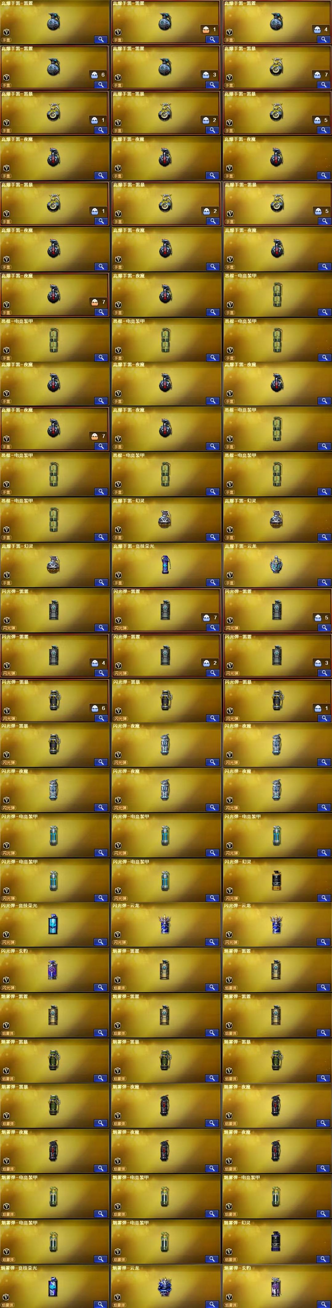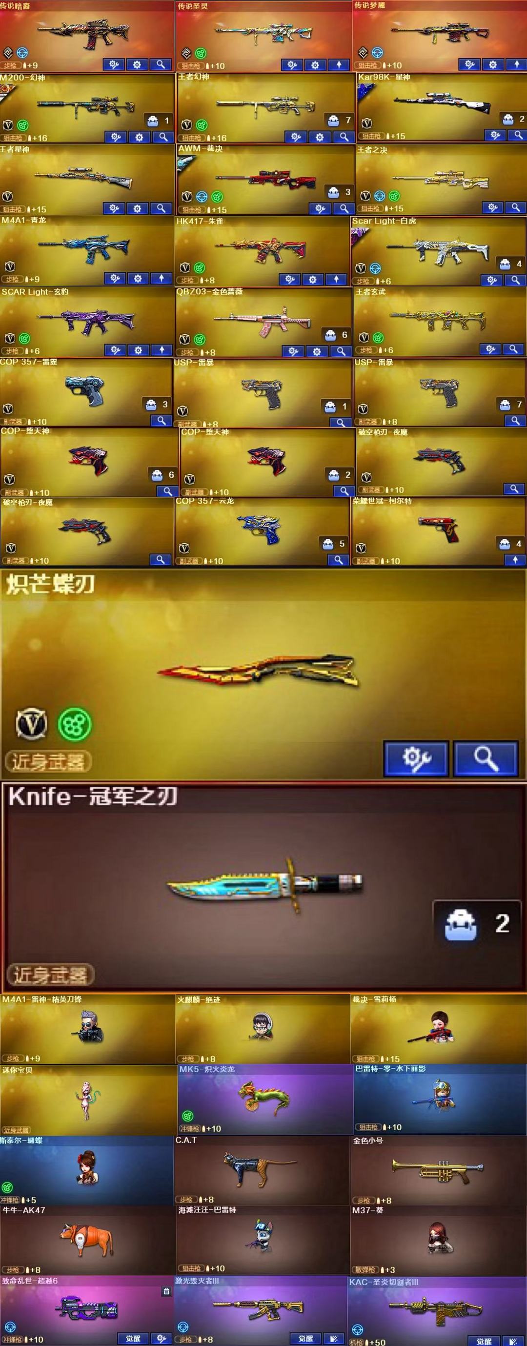 装备描述:王者武器:王者玄武;王者之锋-觉醒版;王者星神-觉醒版;超新星-悦享-觉醒版;王者之光-觉醒版;王者炎心-觉醒版;炫金骑士;王者之击-觉醒版;炫金黑龙;王者之魄闪光弹;王者之势-觉醒版;炫金天龙;王者之怒-觉醒版;王者之武;王者之决-觉醒版;炫金天神;炫金火麒麟;炫金雷神;王者之灵;炫金毁灭;炫金修罗;王者幻神-觉醒版;王者之啸-觉醒版;王者之魄-觉醒版;王者之心-觉醒版;炫金武士 英雄武器:烟雾弹-玄豹;闪光弹-玄豹;SCAR Light-玄豹;机械迷城-穹宇;AWM-裁决;闪光弹-云龙;炽芒蝶刃;云龙扇;COP 357-云龙;高爆手雷-云龙;烟雾弹-云龙;闪光弹-雷霆;雷霆之契;雷霆之锋;烟雾弹-雷霆;高爆手雷-雷霆;高爆手雷-幻灵;幻灵之锋;无影-神兵利器;AK-47-猩红传说;擎天-竞技荣光;闪光弹-竞技荣光;烟雾弹-竞技荣光;高爆手雷-竞技荣光;传说梦魇;9A91-烈火;AN94-超新星;M4A1-死神;屠龙;烟雾弹-幻灵;闪光弹-幻灵;M4A1-青龙;传说圣灵;Barrett-暗月传说;Barrett-毁灭;AK47-B-常胜将军;AK47-B-战士;AK47-B-身先士卒