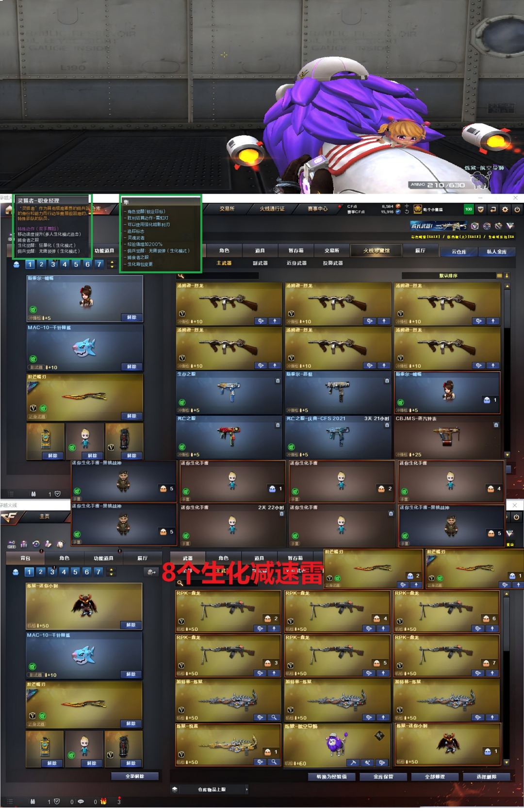 装备描述:排位:可以.........................生化四防压力号(可以查看生化僵尸血量):无需换弹、6烈龙、6盘龙、炼狱-航空导狮、死亡之眼、斯太尔-蝴蝶、斯太尔-幻面灵狐、MAC-千针棘鲨、2把炽芒蝶刃、手斧镜、9生化减速雷、超级对讲机、减少停顿道具、全部弹、、、、、爆破四防:幻神2皮(星耀、电流骇客)传说幽瞳、王者幻神(已经觉醒)、COP-雷霆王者、COP-堕天神、、、传说暗裔、白虎、火麒麟--灵狐、火麒麟--绝迹、CAT猫枪、金色小号、王者炎心、王者冰魄、、裁决音效、星神音效、极光音效、黑龙音效、毁灭音效、火麒麟音效、、、、1套玄豹、7套夜魔、幻灵、电竞装甲、、、爆破四防(凌霄、王者葵貂蝉)、生化四防(隼、职业经理)