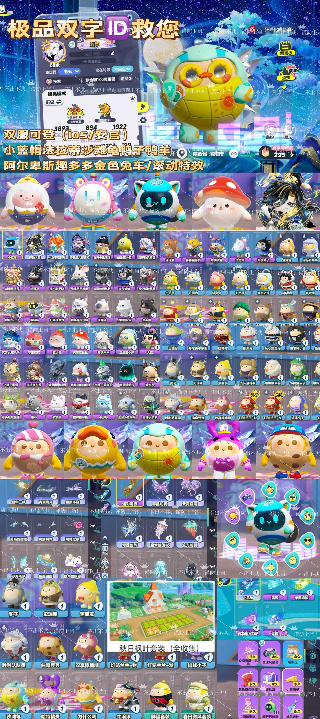 装备描述:有古早小蓝帽 沙滩龟 鸭子 法拉蒂 喜欢的宝宝求好评噢!喜欢可以收藏店铺,进 店选 号哦! 【健 康系统不用撤单直接登录,需要验 证用任意手机号码发送即可】衣柜看图片详情,喜欢可以收藏!苹果安卓互通均可登录 已绑定登录成功提醒, 恶意维q/白嫖,永久拉黑