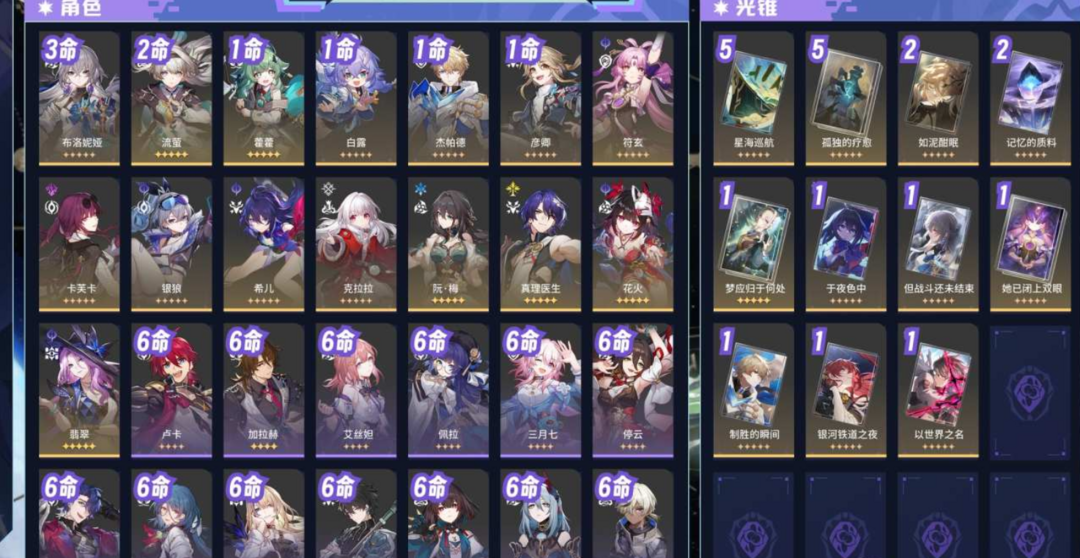 70级,45黄,女主,15个五星角色:3命布洛妮娅,2命流萤,1命藿藿,1命杰帕德,1命白露,1命彦