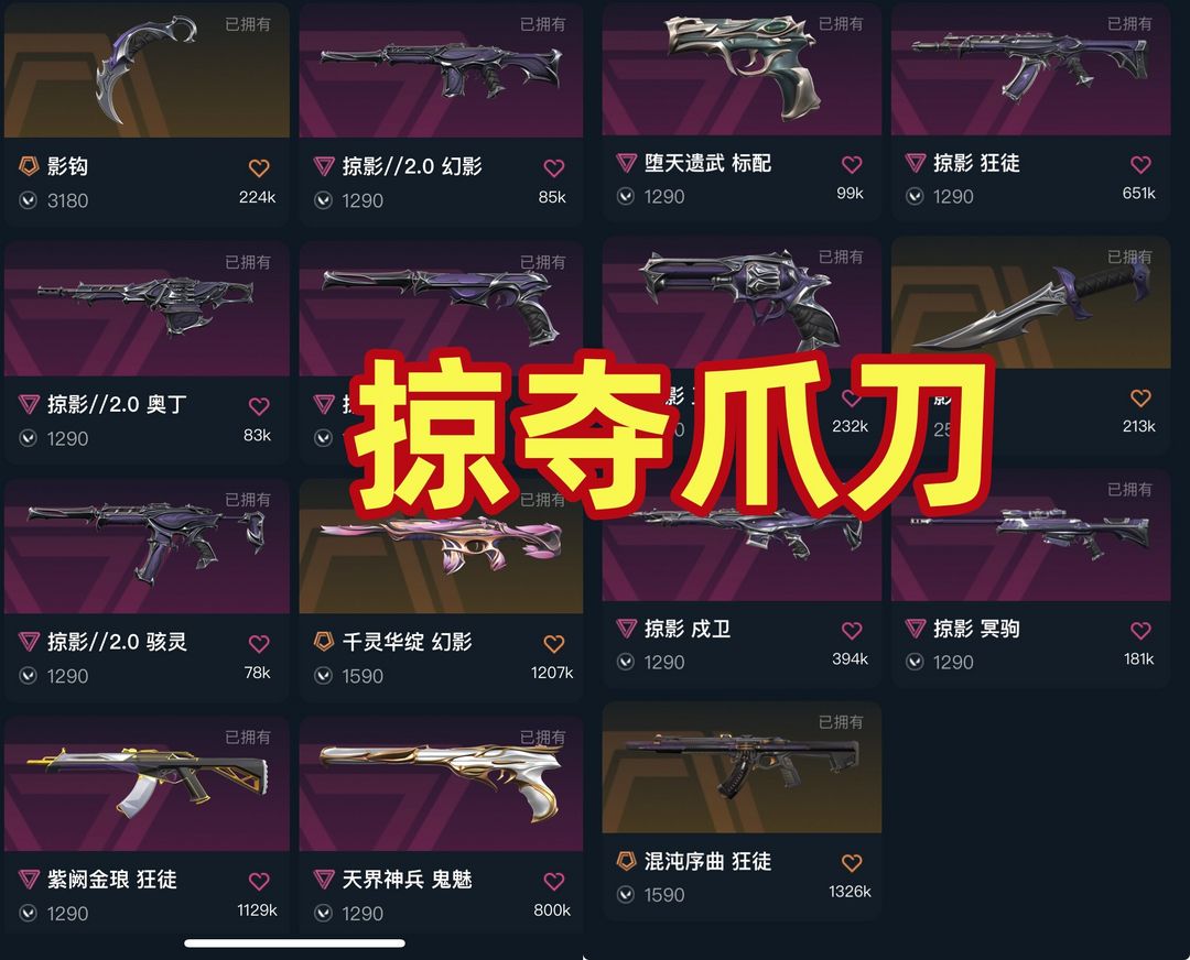 可排★掠夺2.0套装★掠夺爪刀影钩★掠夺狂徒★掠夺幻影★紫金狂徒★天界鬼魅★弃王标配★莲花幻影