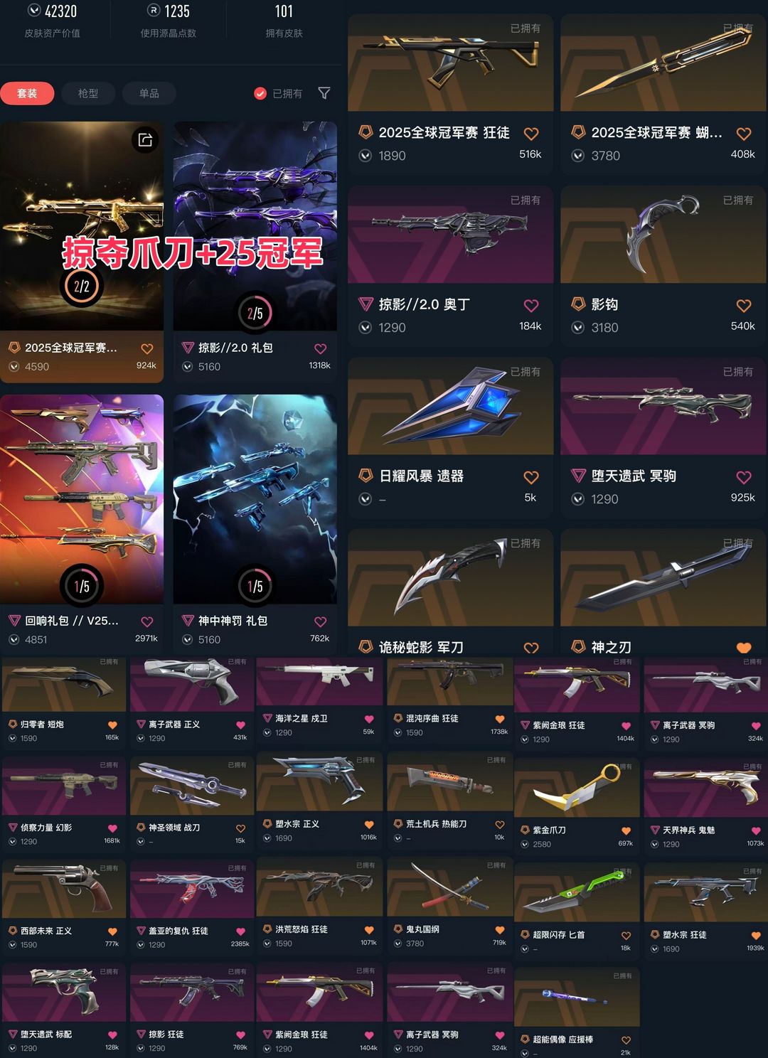 可排✅25冠军套⭐紫金盖亚混沌虚无显卡狂徒⭐vct爪刀剥皮小刀落英飞旋蝴蝶刀⭐黯夜怪谈⭐奇点正义破败