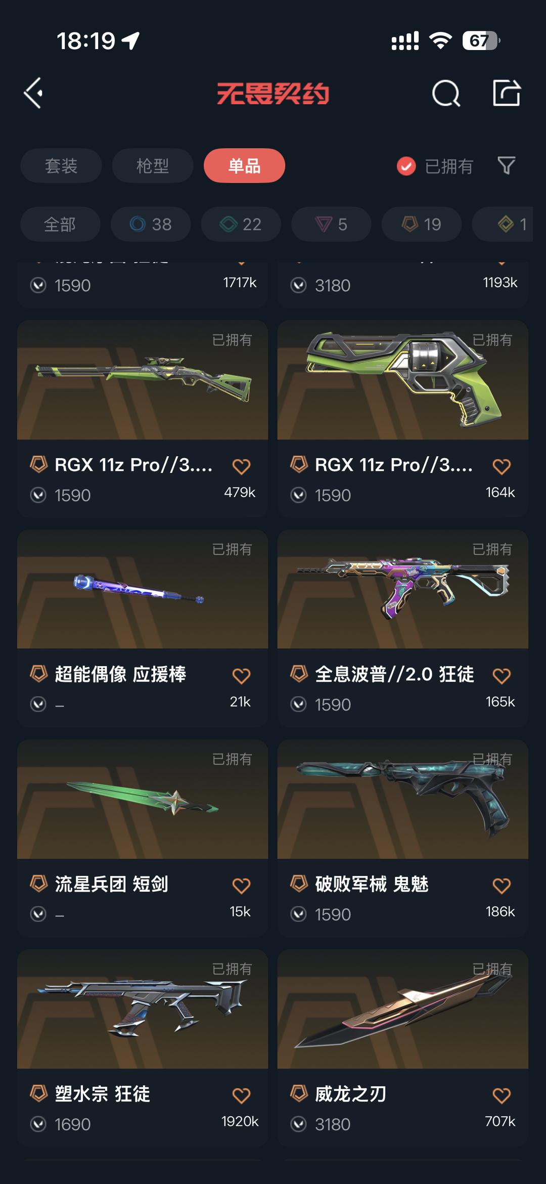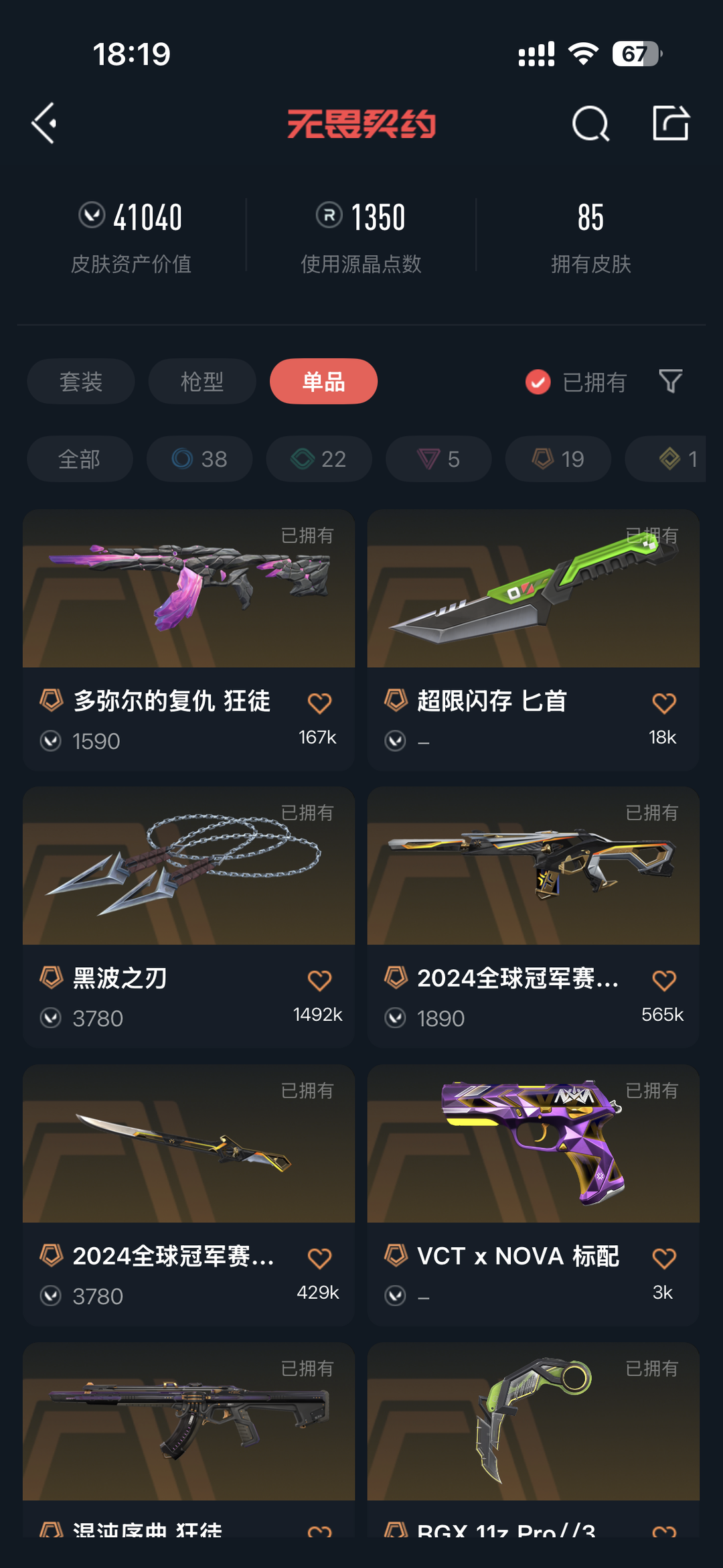 装备描述:绝版离火刃-24冠军套-黑波-显卡爪刀-起源冥狙-全息波普//2.0 狂徒-塑水宗 狂徒-堕天遗武 狂徒-盖亚的复仇 狂徒-781-A协议 獠犬-离子武器 正义-显卡正义-显卡莽侠- 破败军械 鬼魅- 威龙之刃-多弥尔的复仇 狂徒-VCT xNOVA 标配-混油序曲 狂徒-堕天遗武 狂徒