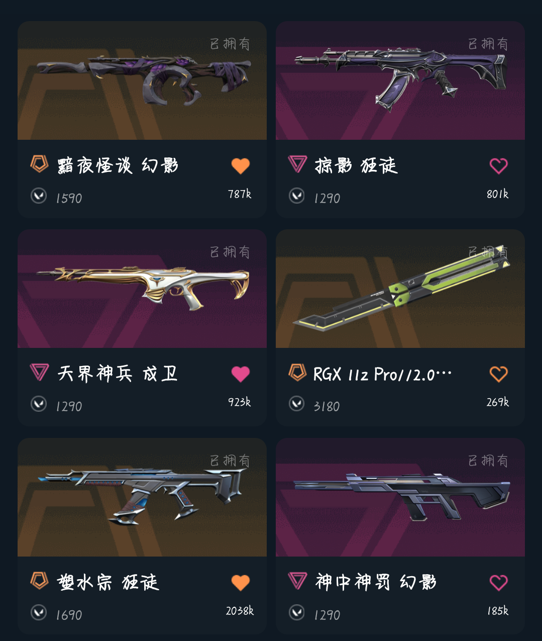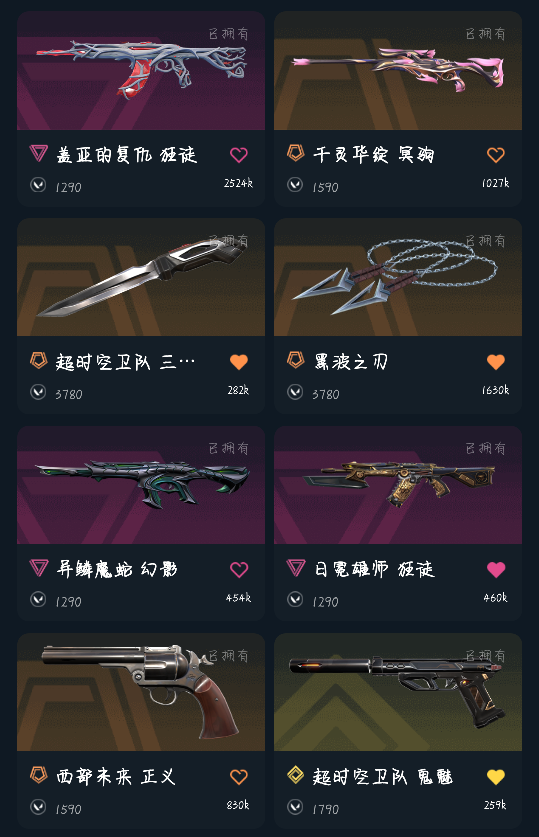 军刺,黑波,天界戍卫,塑水宗,掠夺,古神幻影,西部正义,超时空鬼魅,狮子,蛇年幻影,盖亚,莲花大狙