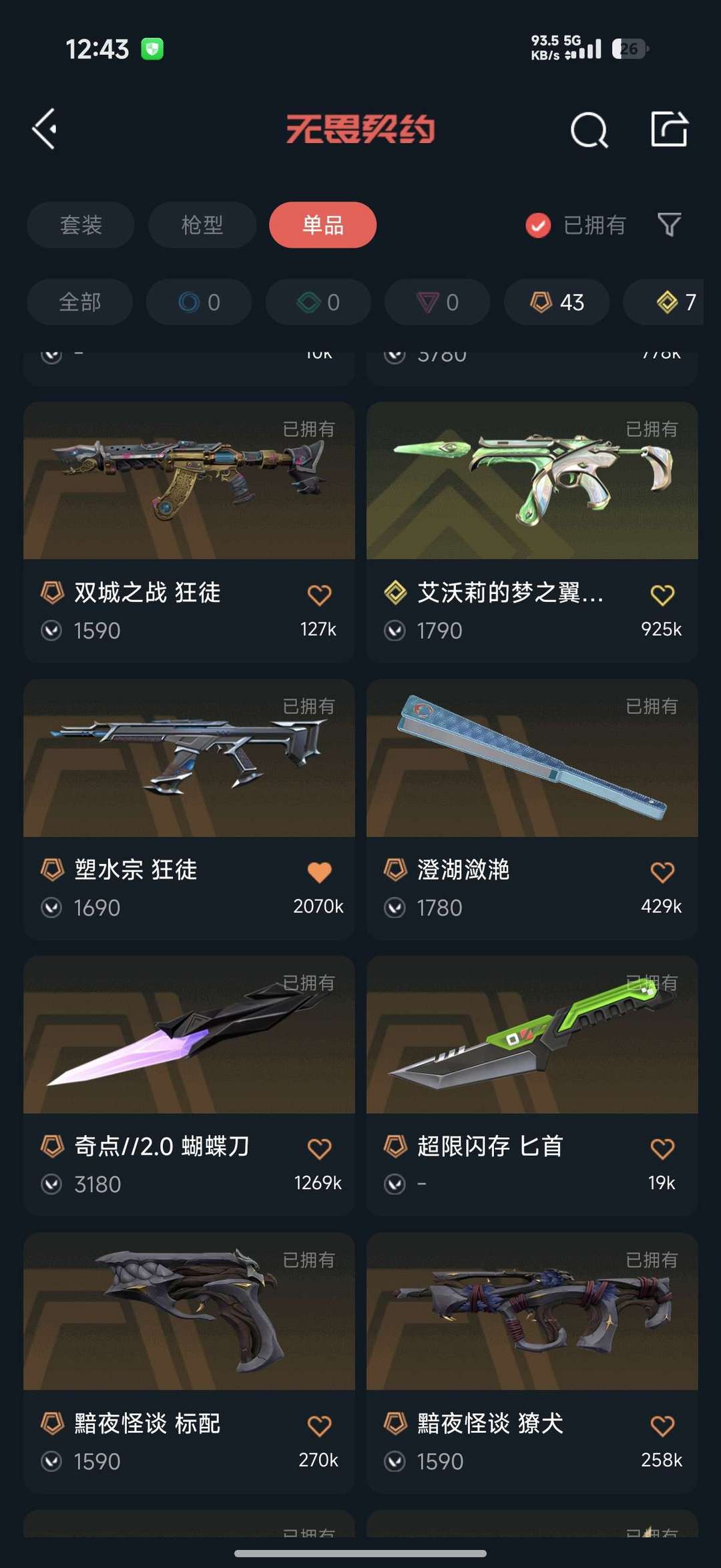 装备描述:AK:星之守护,混沌,双城之战,塑水宗,威龙, 幻影:侦察,末日泡泡, 刀:湖扇,鬼丸国纲,洪荒双斩,奇点2.0, 正义:塑水宗, 大狙:龙驹, 鬼魅:天界神兵, 骇灵:星之守护, 标配:VCT25XBLG标配(粉白色), 莲花套2.0,25冠军,噬影者,西部未来,暗夜怪谈,电玩套(以上都是全套)