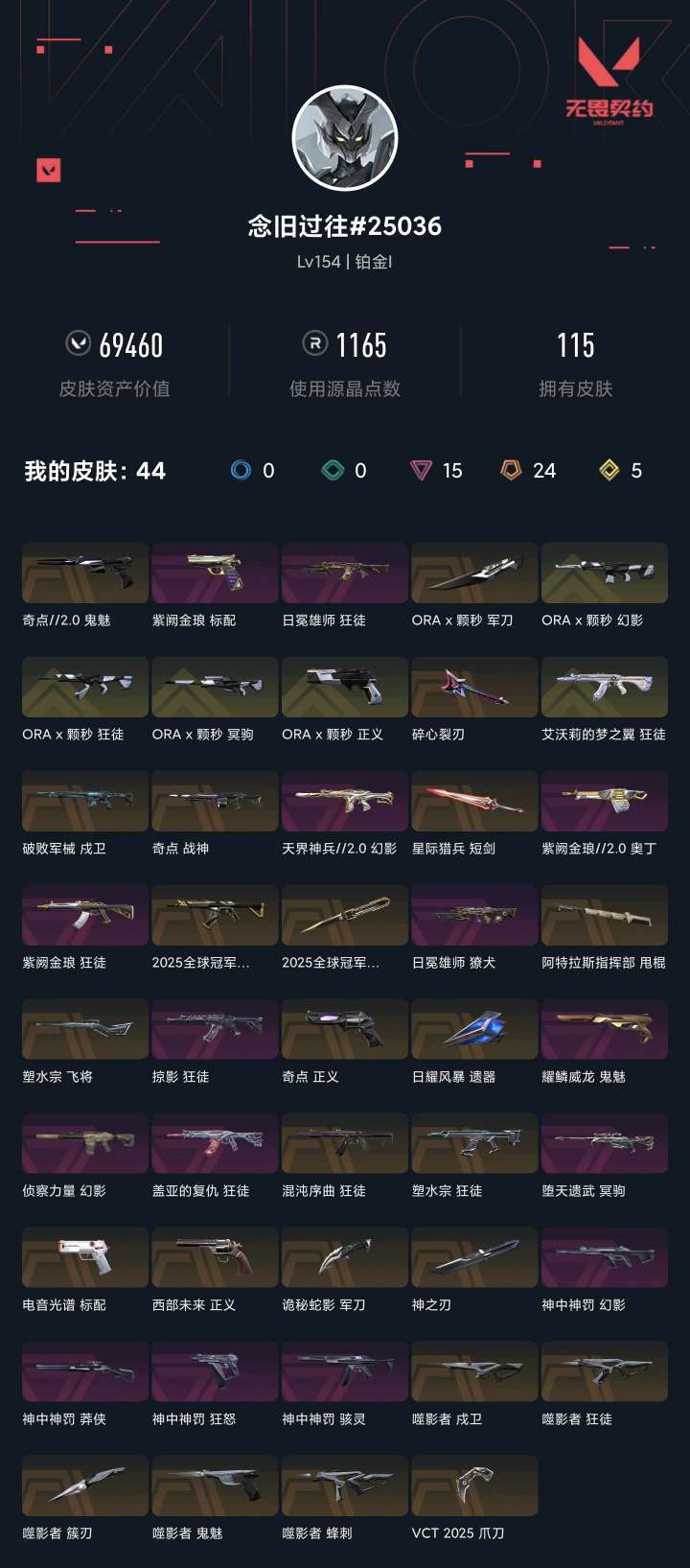 装备描述:除了喷子都有特效皮,主战皮都是多把特效皮并且有盖亚狂徒和侦查幻影,⭐️vct爪刀⭐️25冠军套⭐️塑水宗狂徒+鸟狙⭐️电音光谱标配⭐️奇点正义⭐️西部正义⭐️神中神罚全套⭐️噬影者全套