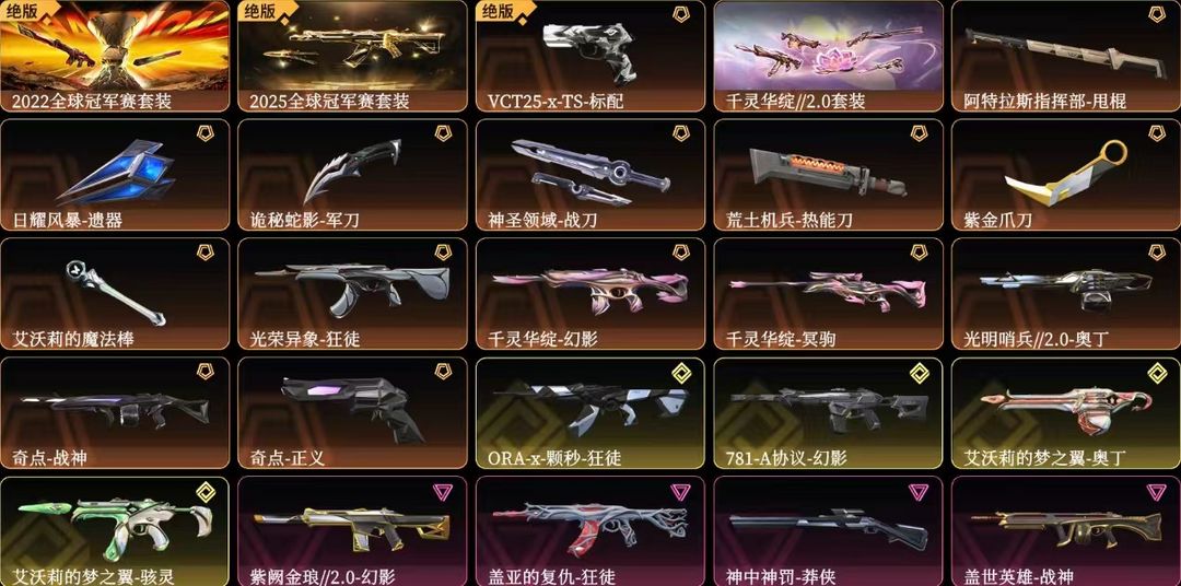 装备描述:可排位✨皮肤数量92✨✨2022全球冠军赛套装✨千灵华绽//2.0套装✨2025全球冠军赛套装✨紫金爪刀✨艾沃莉的魔法棒✨光荣异象-狂徒✨千灵华绽-幻影✨ORA-x-颗秒-狂徒✨781-A协议-幻影✨紫阙金琅//2.0-幻影✨盖亚的复仇-狂徒✨千灵华绽-冥驹✨神中神罚-莽侠✨光明哨兵//2.0-奥丁✨奇点-战神✨艾沃莉的梦之翼-奥丁✨盖世英雄-战神✨艾沃莉的梦之翼-骇灵✨VCT25-x-TS-标配✨奇点-正义✨源能者危机001-标配