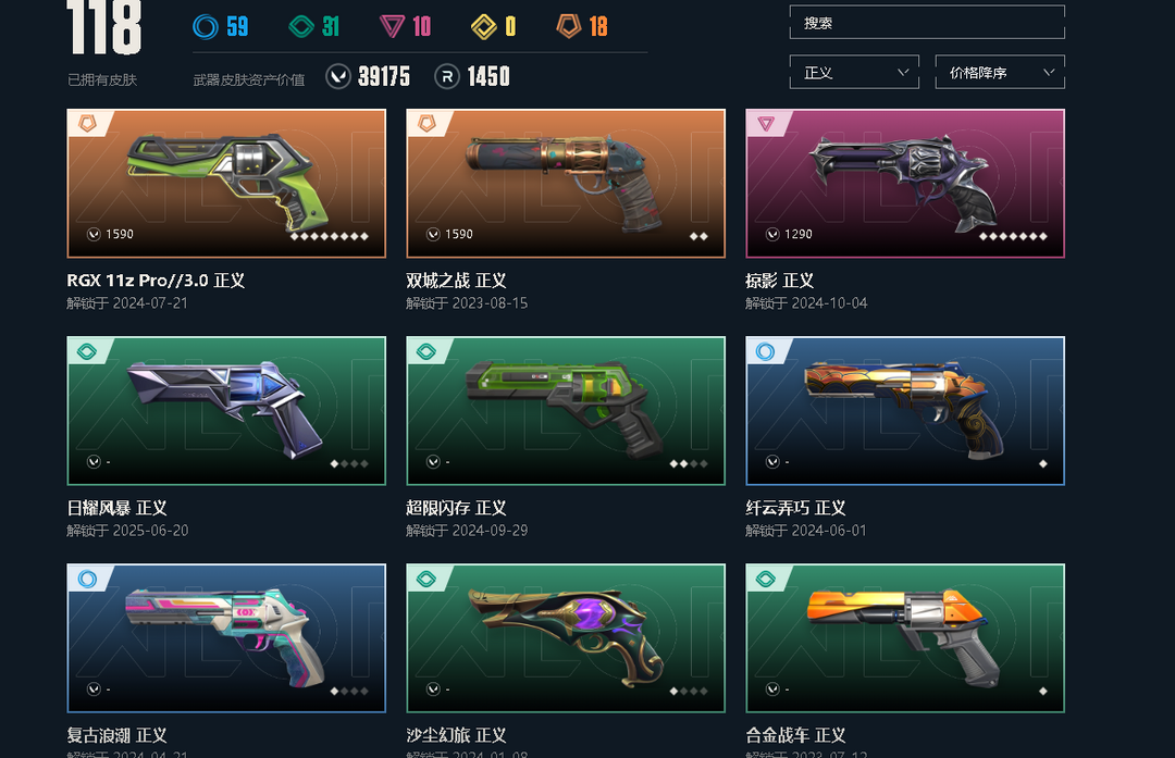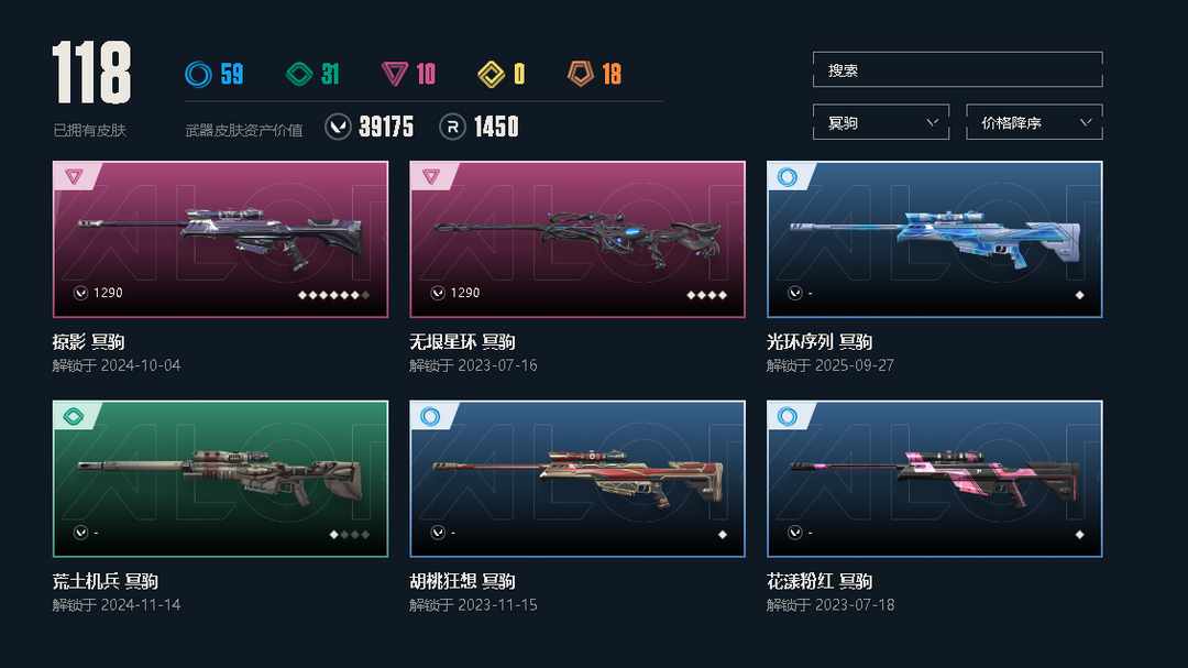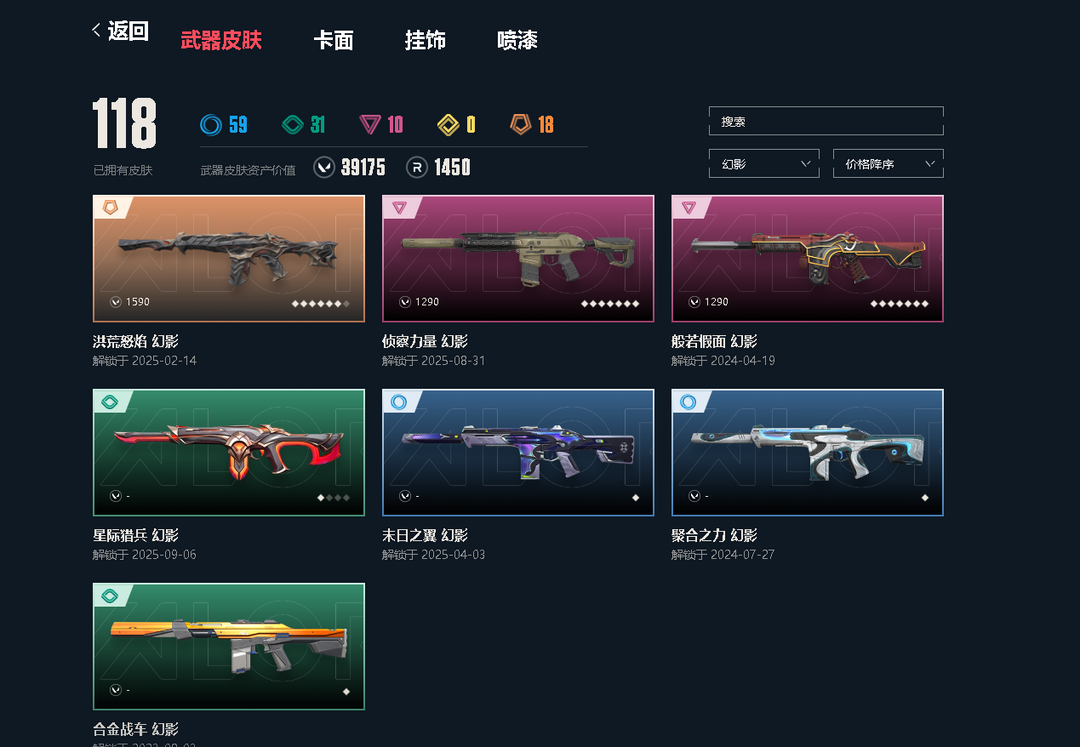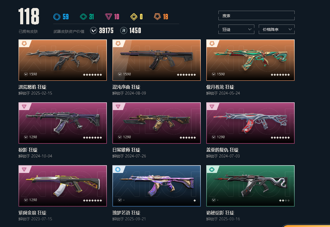 装备描述:可排位,可用R点,主站狂徒和幻影皮肤的齐全,掠影全套.仓库价值4W,118个皮肤,盖亚流脓,紫金爪刀