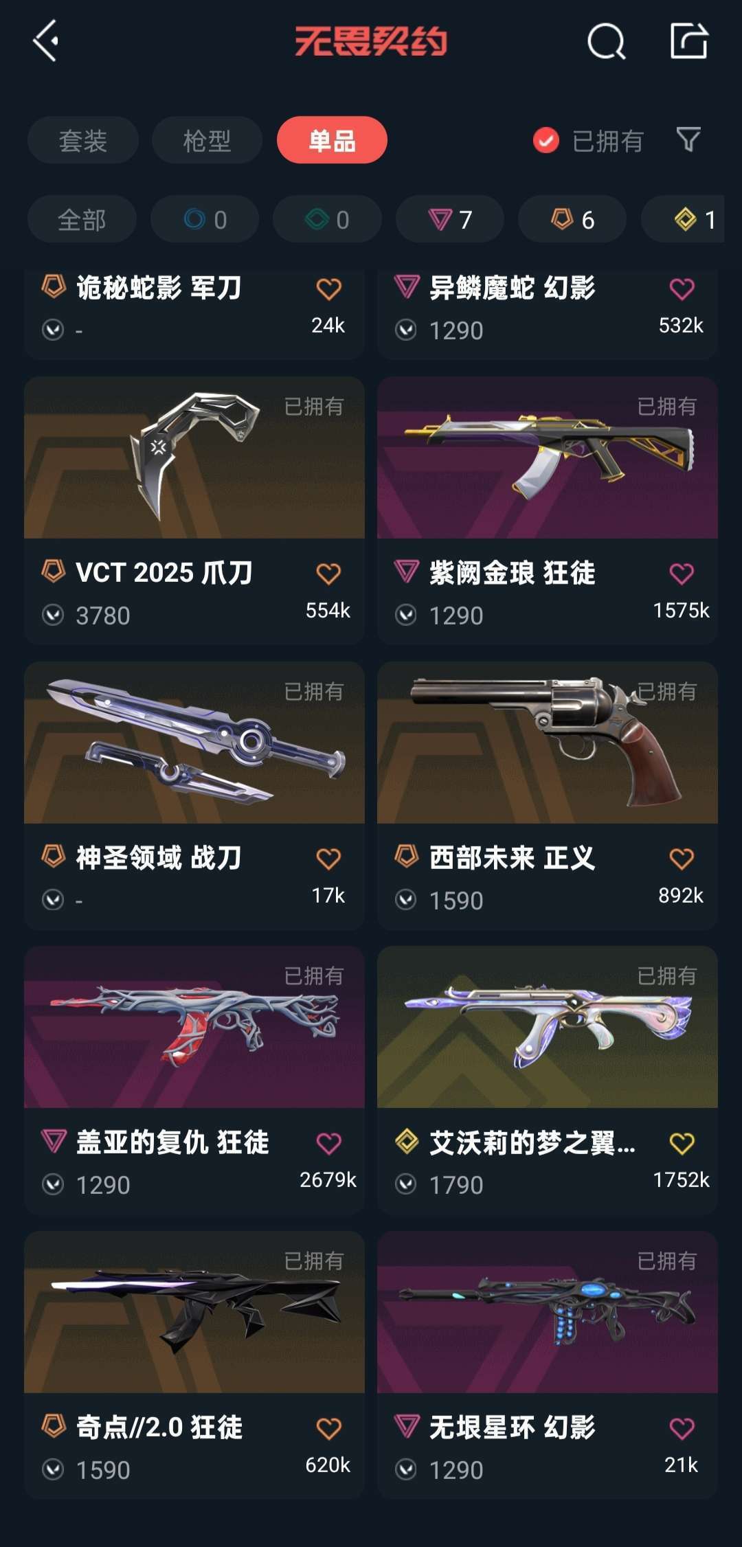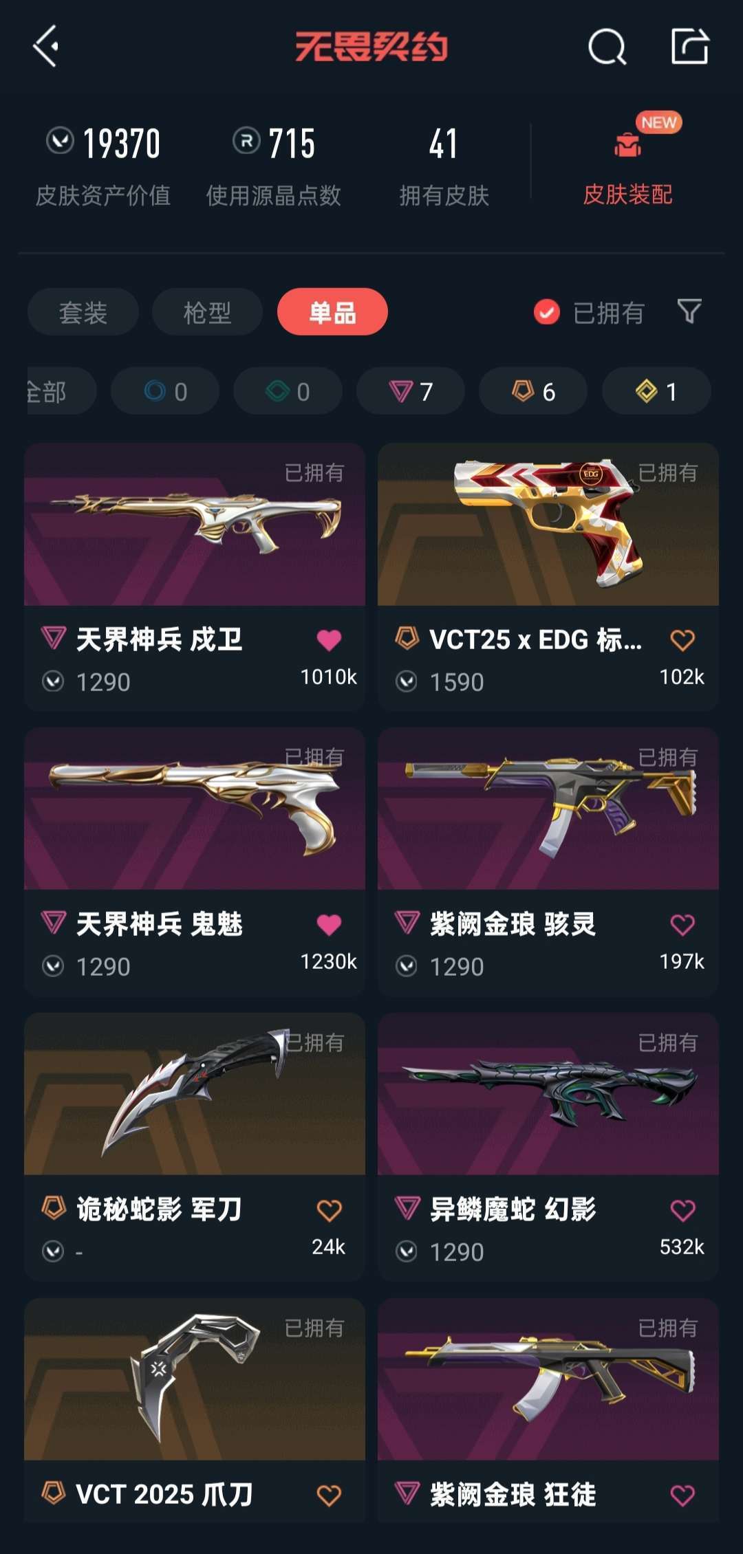 全英雄 vct爪刀 盖亚狂徒 紫金狂徒 艾沃莉狂徒 蛇年幻影 25edg标配 天界戍卫 天界鬼魅