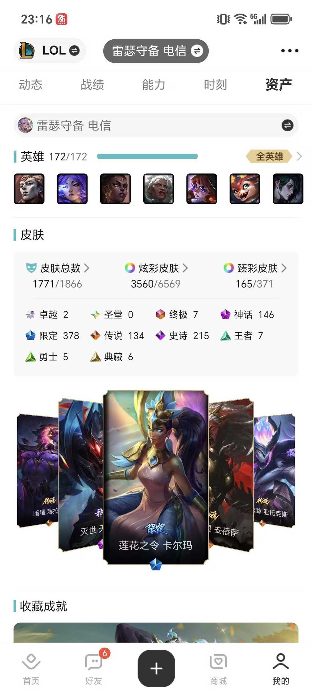 装备描述:全英雄,9500皮肤。至臻阿狸小鱼女枪锤石塞纳佐伊亚索星妈,七色龙瞎,斩星剑圣,穿星赵信,冰原女警,庆典女皇,战熊骑士,海克斯鳄鱼波比龙龟牛头。全年限,全周年,全皮肤套。