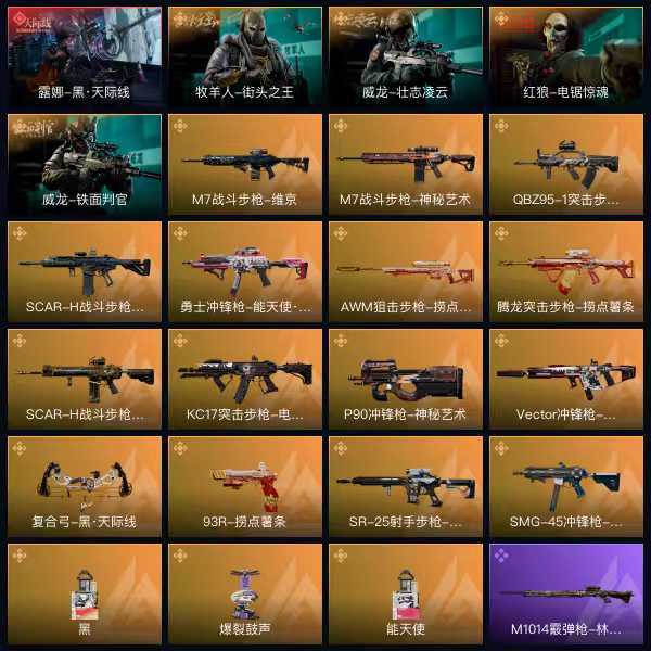 皮肤号 露娜黑•天际线 威龙壮志凌云+铁面判官+牧羊人街头之王+10个金枪皮破产请跑刀