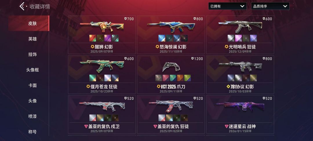 24级收藏家 VCT 2025 爪刀 偃月苍龙狂徒 光明哨兵 狂徒 怒海惊澜 幻影 醒狮幻影