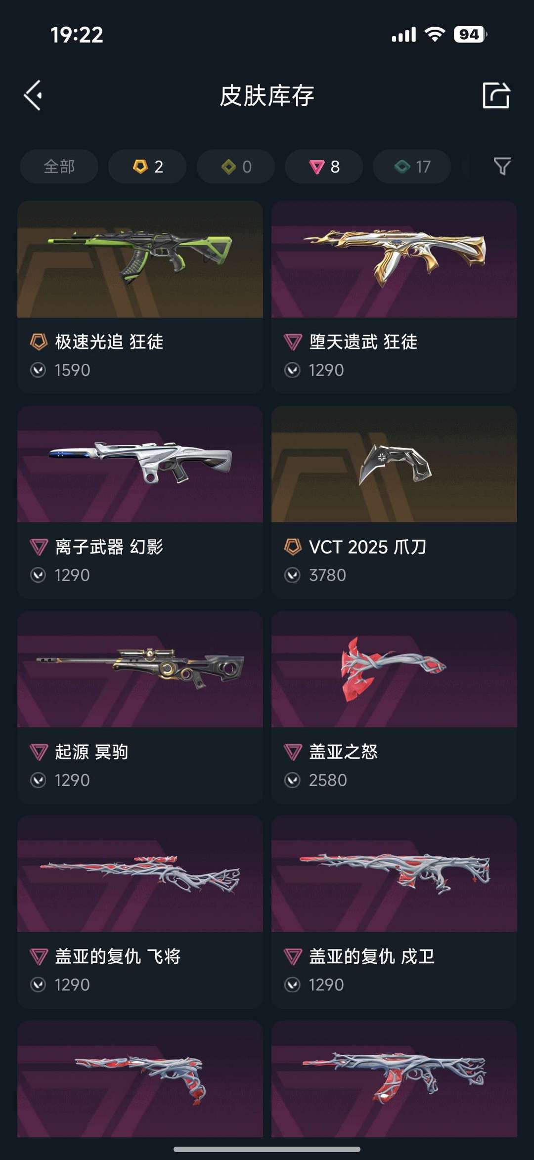全英雄❤️盖亚一整套❤️vct爪刀❤️极速光追❤️堕天使狂徒❤️离子幻影❤️起源冥狙❤️基本全满级
