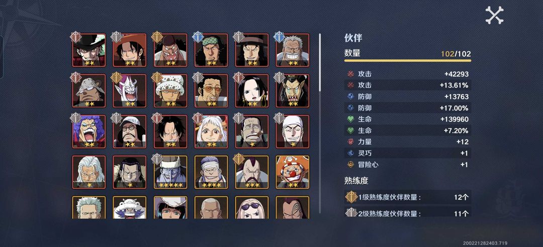装备描述:雷利顶上老沙大和已出/全角色/102伙伴20红/1.9亿赏金/22区