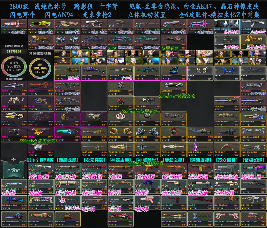限制: 租号5次及以上 |装备描述:【有建议请您⑤星好评+留言,谢谢】 ★浅绿色称号3600级,至尊金鸡炮,白金AK47![2018赛季精英] ★绝版装饰:立体机动装置。恶魔猎手晶石神像皮肤!雷文畅、叶无心! ★特典武器:黯影狙、歼星十字弩等。 ★全部武器全6攻6恢复,请您去仓库里自行切换! 【玩过别忘收藏!!!用心打造极品账号,给您最棒的游戏体验!】