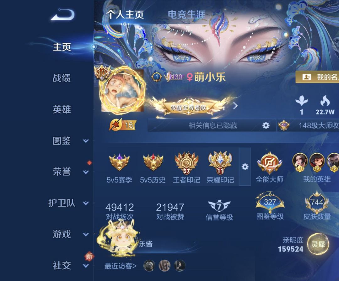 荣耀贵族744 图鉴328级灵犀灵宝 诸葛白泽全按键皮肤 福星动态签名 全小兵天幕❤️148级收藏