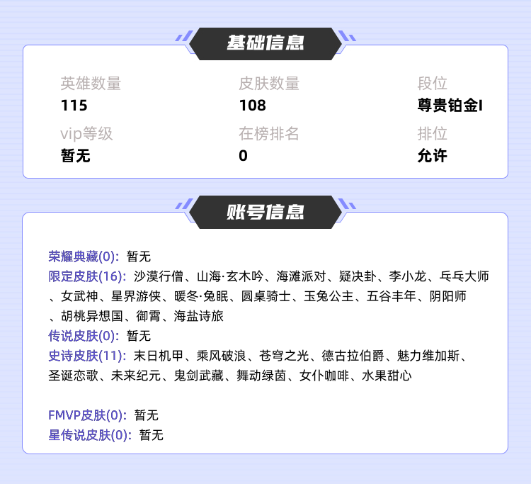 装备描述:本游戏账号: ,英雄多,皮肤多。 私人所属英雄皮肤有:暃 星界游侠||达摩 沙漠行僧||马可波罗 山海·玄木吟吕布 末日机甲||夏侯惇 乘风破浪||妲己 女仆咖啡||妲己 魅力维加斯||宫本武藏 鬼剑武藏||貂蝉 圣诞恋歌,等等 注意事项: A.游戏过程中请不要恶意挂机或者不文明发言;B.恶意挂机、顶号等行为将被拉黑无法再次下单;C.进入游戏后中途请勿退出登陆,否则无法再次上号;D.部分账号由于异地登录可能会出现密码错误提示,通常再尝试5-6次后可上号。 ||||||||>喜欢本账号请点 ☆收藏☆ 方便下次租用,谢谢光临惠顾|||||||||