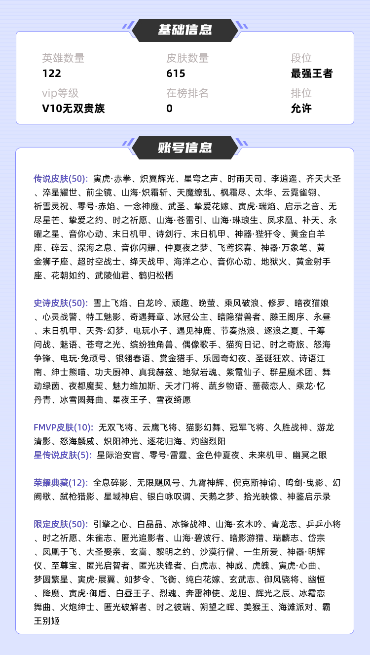 限制: 撤单率<50%才可租用此帐号装备描述:>>>>>>毁号,涉及毁坏虚拟财产罪及计算机安全罪,请文明游戏素质游戏,让我们共建美好租号平台>>>>>> 本游戏账号: V10荣耀贵族用户,基础段位:最强王者,英雄多,皮肤多。典藏皮肤11个,感受典藏皮肤带来的优质体验快感,FMVP皮肤10个,尽情享受FMVP皮肤带来的主角光环, 私人所属英雄皮肤有:貂蝉 幻阙歌||虞姬 神鉴启示录||韩信 弑枪猎影||铠 银白咏叹调||花木兰 九霄神辉||诸葛亮 星域神启||孙悟空 全息碎影||夏侯惇 无限飓风号||李白 鸣剑·曳影||小乔 天鹅之梦||武则天 倪克斯神谕,等等 注意事项: A.游戏过程中请不要恶意挂机或者不文明发言;B.恶意挂机、顶号等行为将被拉黑无法再次下单;C.进入游戏后中途请勿退出登陆,否则无法再次上号;D.部分账号由于异地登录可能会出现密码错误提示,通常再尝试5-6次后可上号。 |||||||||>喜欢本账号请点 ☆收藏☆ 方便下次租用,谢谢光临惠顾|||||||||