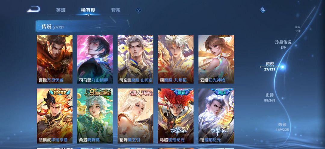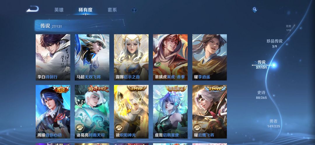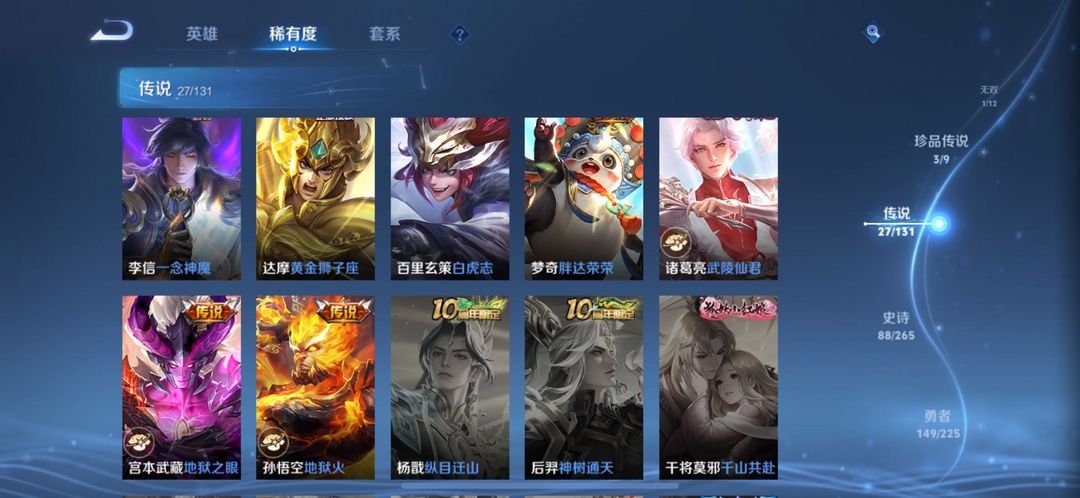 装备描述:全皮老虎,白虎志,大圣娶亲,幽冥火,无双飞将,炽阳神光,银白咏叹调,李逍遥,幽冥之眼,武陵仙君,一念神魔,梅西,九山相柳,神罪等热门皮肤