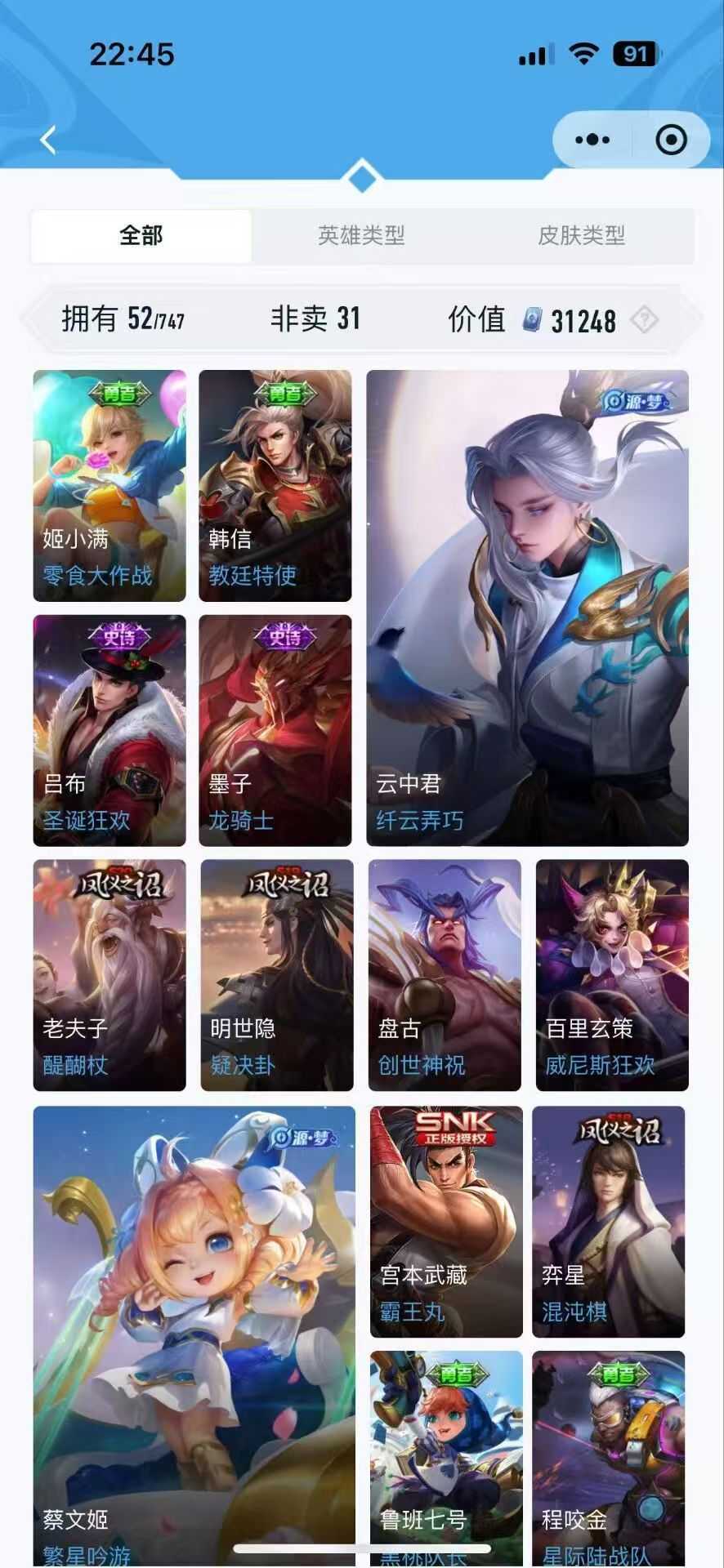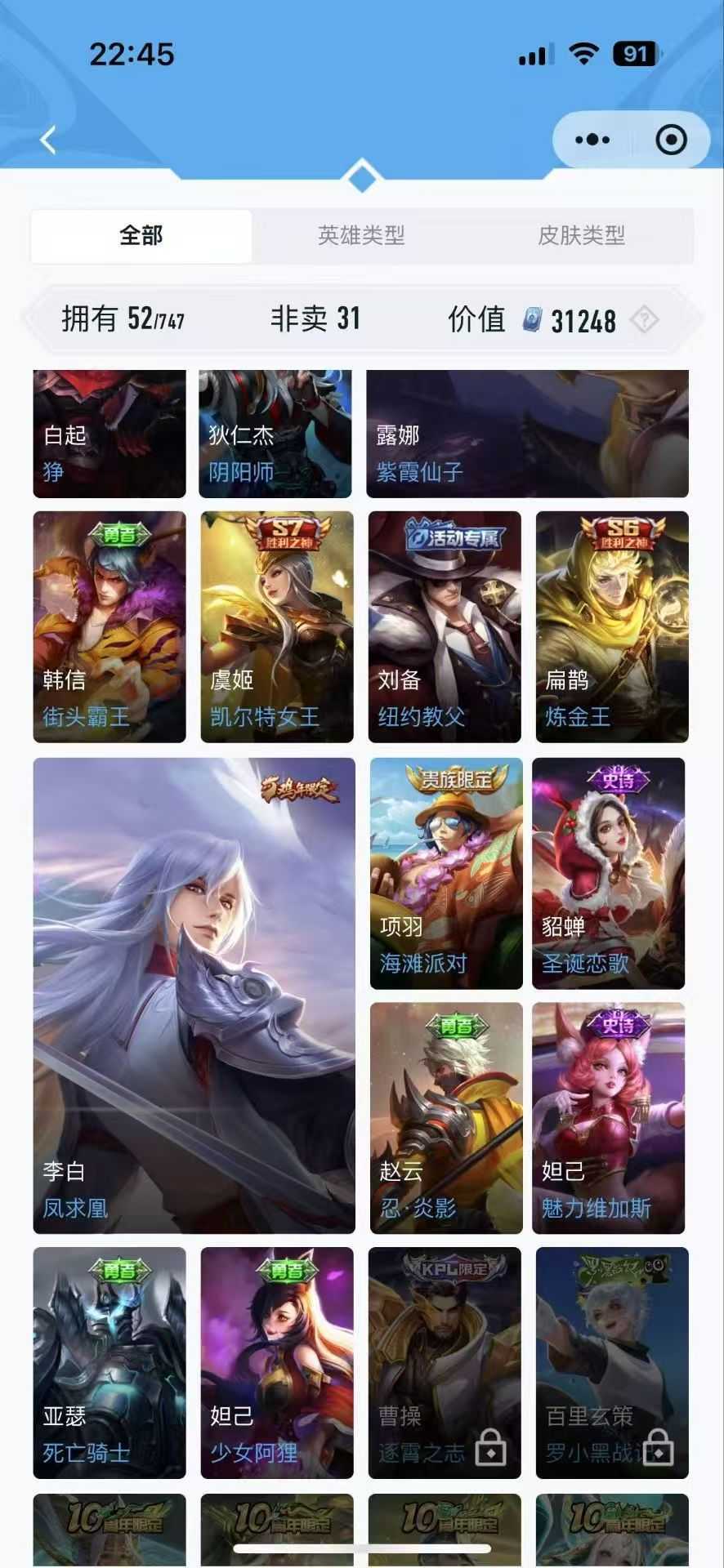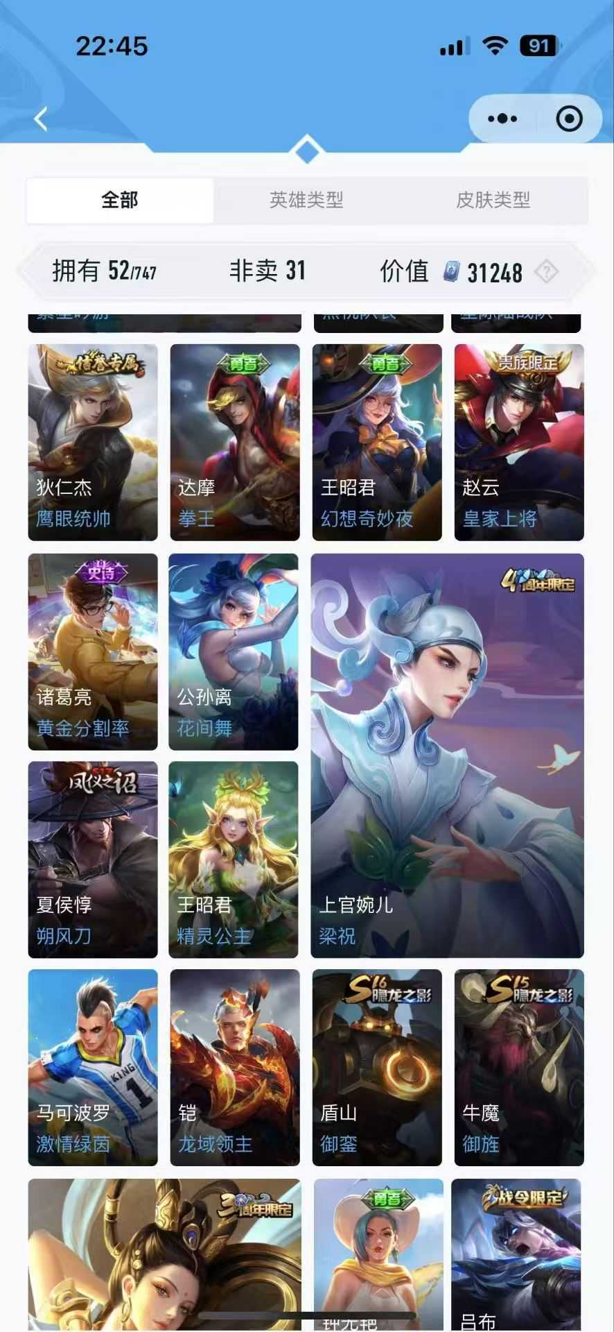 限制: 租号3次及以上 |装备描述:此号是极品排位虐菜号 可打排位 毁号,涉及毁坏,请文明游戏素质游戏,让我们共建 美好租号平台本游戏账号:英雄多皮肤多。注意事 项: A .游戏过程中请不要恶意挂机或者不文明发言 B .恶意挂机、顶号等行为将被拉黑无法再次下单 C .进入游戏后中途请勿退出登录 夏洛特 浮生妄 永昼 武则天 神器·明辉仪 亚连 破空之剑 嬴政 暗夜贵公子 马超 访茗客 琥珀纪元 神威 无双飞将 元歌 无心 达摩 黄金狮子座 达摩 沙漠行僧姜子牙 星梦巡礼猪八戒 潮玩探月行 吕布 逐霄战戟 暃 埋骨钱 不知火舞 花合斗 绯月行大司命 东方月初 暗都幽影 敖隐诸葛亮 时雨天司 铠 冥王哈迪斯 银白咏叹调 马可波罗 山海·玄木吟 深海之息 姬小满 战舞者 项羽 苍威无极 苍穹之光 虞姬 夏日便利店 神鉴启示录 启明星使 朵莉亚 心动手记 孙尚香 时之恋人妲己 灵卜魔法 青丘·九尾 刘邦 剑破天穹芈月 浮光幕影 芈月 幻夜卜梦 澜 逐花归海海诺 心动手记艾琳 陌上桑 觅芳踪曜 李逍遥 云鹰飞将
