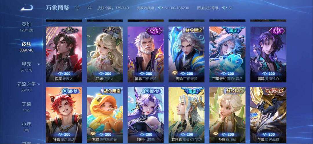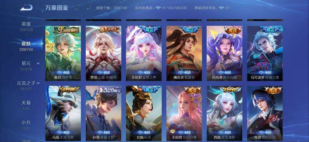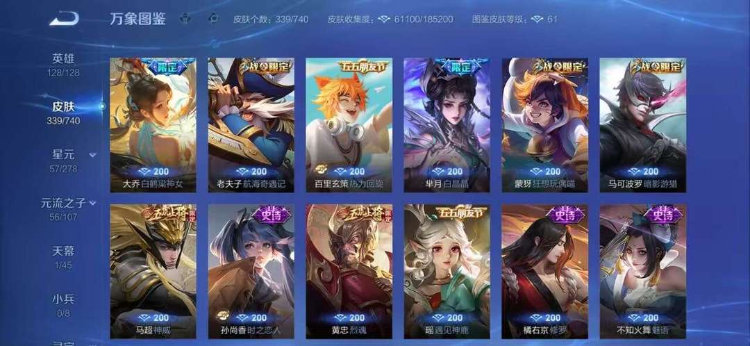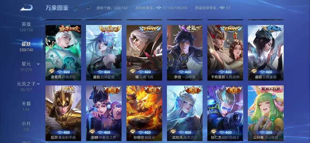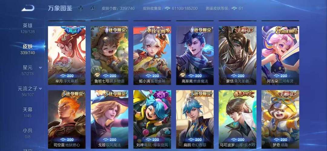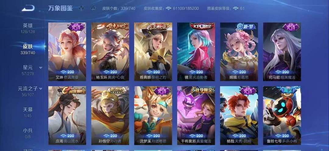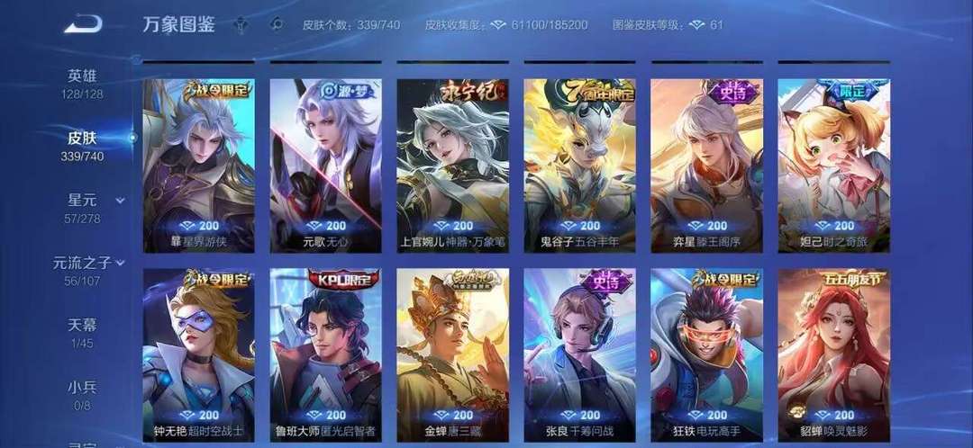 4款荣耀典藏,28款传说,全英雄,满铭文。