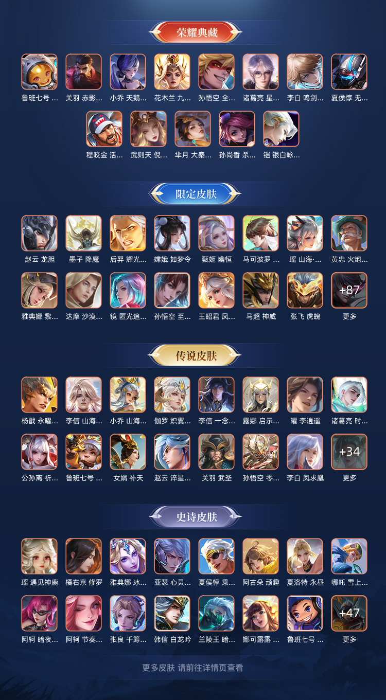 装备描述:贵族等级V10无双贵族,,英雄数量123,典藏皮肤数12,皮肤数量655,天魔缭乱/至尊宝/白虎志/久胜战神/飞衡/器灵·螭龙剑/愿照·九州拓/愿照·众生和/匿光追影者/神器·明辉仪/鸣剑·曳影/时之奇旅(大乔)/赤影疾锋/真我赫兹(瑶)/时之奇旅(鲁班七号)/愿照·福禄聚/无双飞将/至美·化雀舞/遇见神鼓/星域神启/李逍遥/花合斗/涂山红红/霜北刀/逐花归海/器灵·落星盏/武圣/至美·乘鲤谣/鹤羽星尊/时之奇旅(孙策)/离恨烟/愿照·千秋盛/霜月吟/雪境奇遇(甄姬)/东方月初/妄想实况/埋骨钱/夜礼服假面/玉兔公主/补天/怪盗基德/愿照·岁时盈/惊梅引/续相思/异界灵契/神威/炽阳神光/启示之音/影龙天霄/青丘·九尾/江户川柯南/鹤归松栖(云缨)/银白咏叹调/愿照·山河定/时之魔女/傲雪梅枪/时雨天司/天魔缭乱/至尊宝/白虎志/久胜战神/飞衡/器灵·螭龙剑/愿照·九州拓/愿照·众生和/匿光追影者/神器·明辉仪/鸣剑·曳影/时之奇旅(大乔)/赤影疾锋/真我赫兹(瑶)/时之奇旅(鲁班七号)/愿照·福禄聚/无双飞将/至美·化雀舞/遇见神鼓/星域神启/李逍遥/花合斗/涂山红红/霜北刀/逐花归