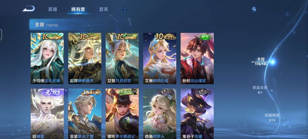 装备描述:12个传说皮肤无双皮肤1史诗皮肤49无双皮铠神罪