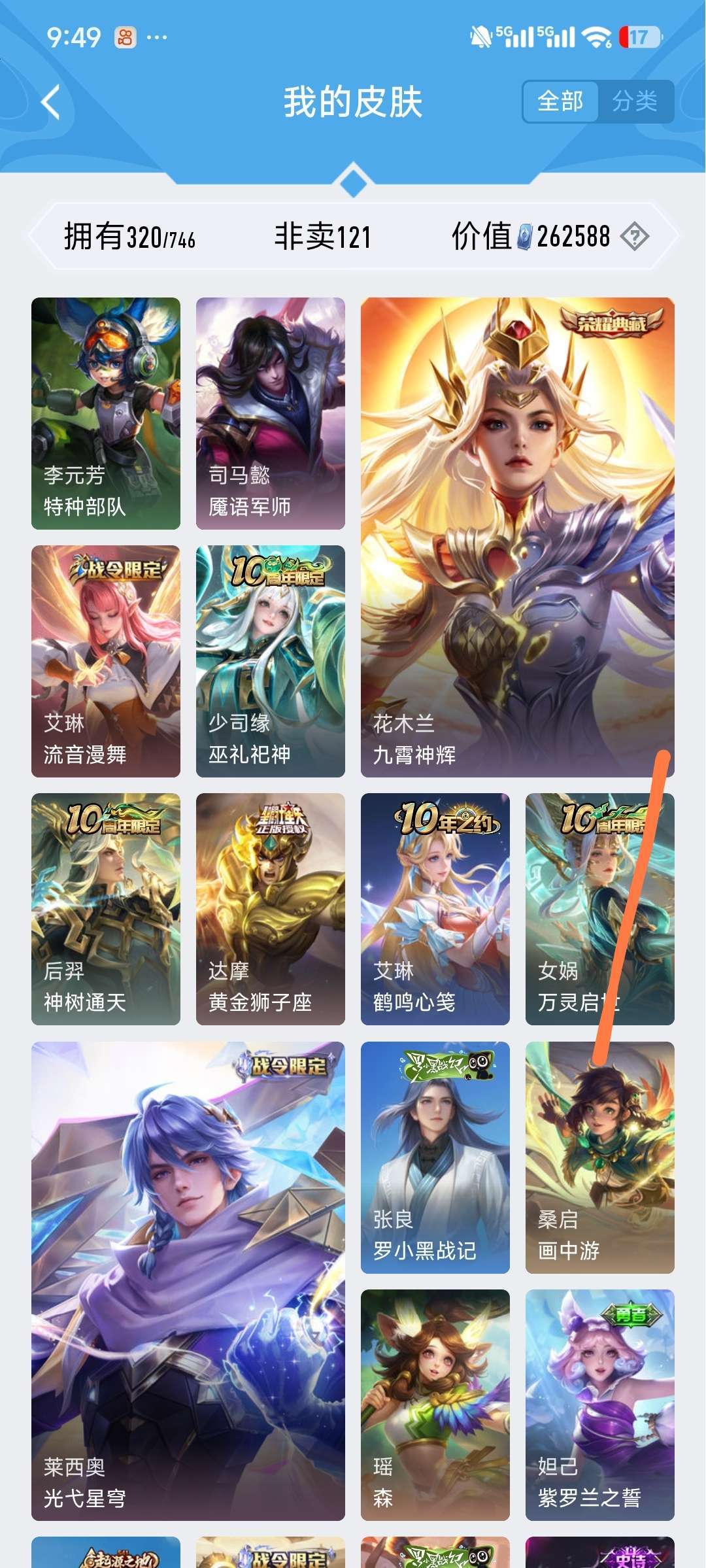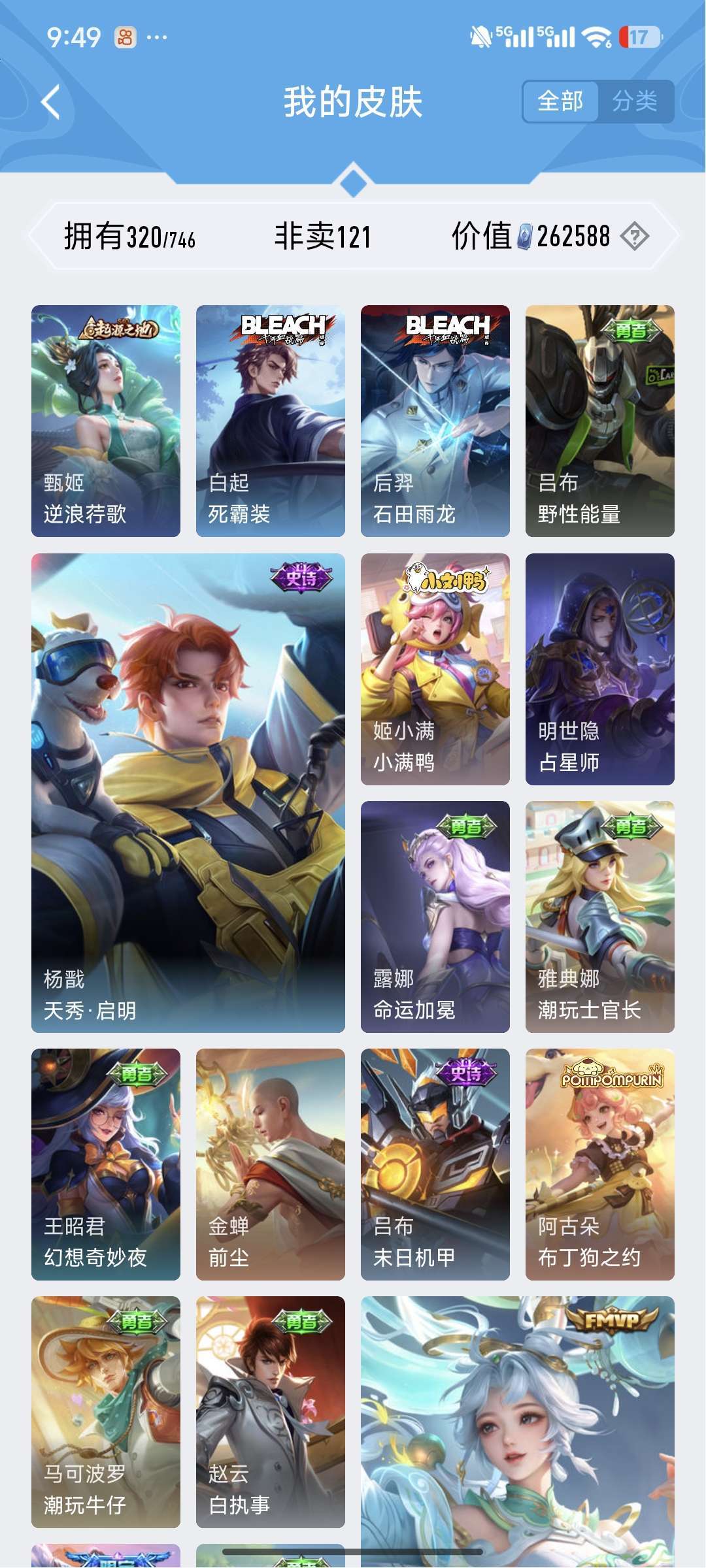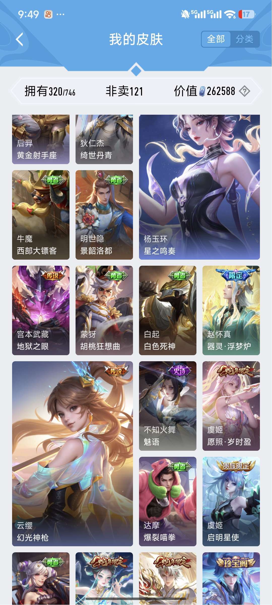 铭文30套,段位目前81星⭐,皮肤数量320个,英雄差个武则天。贵族等级V8