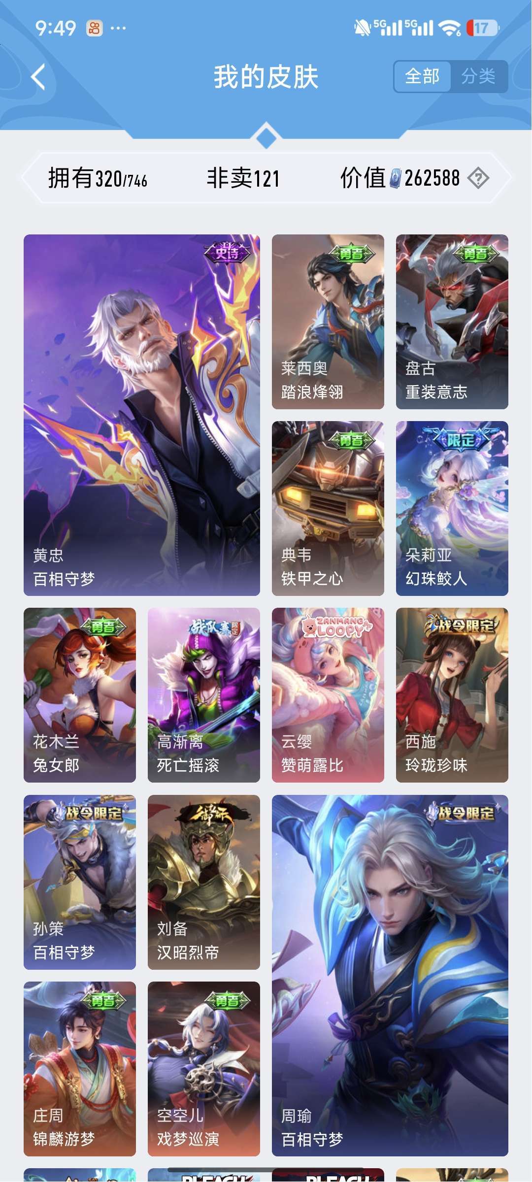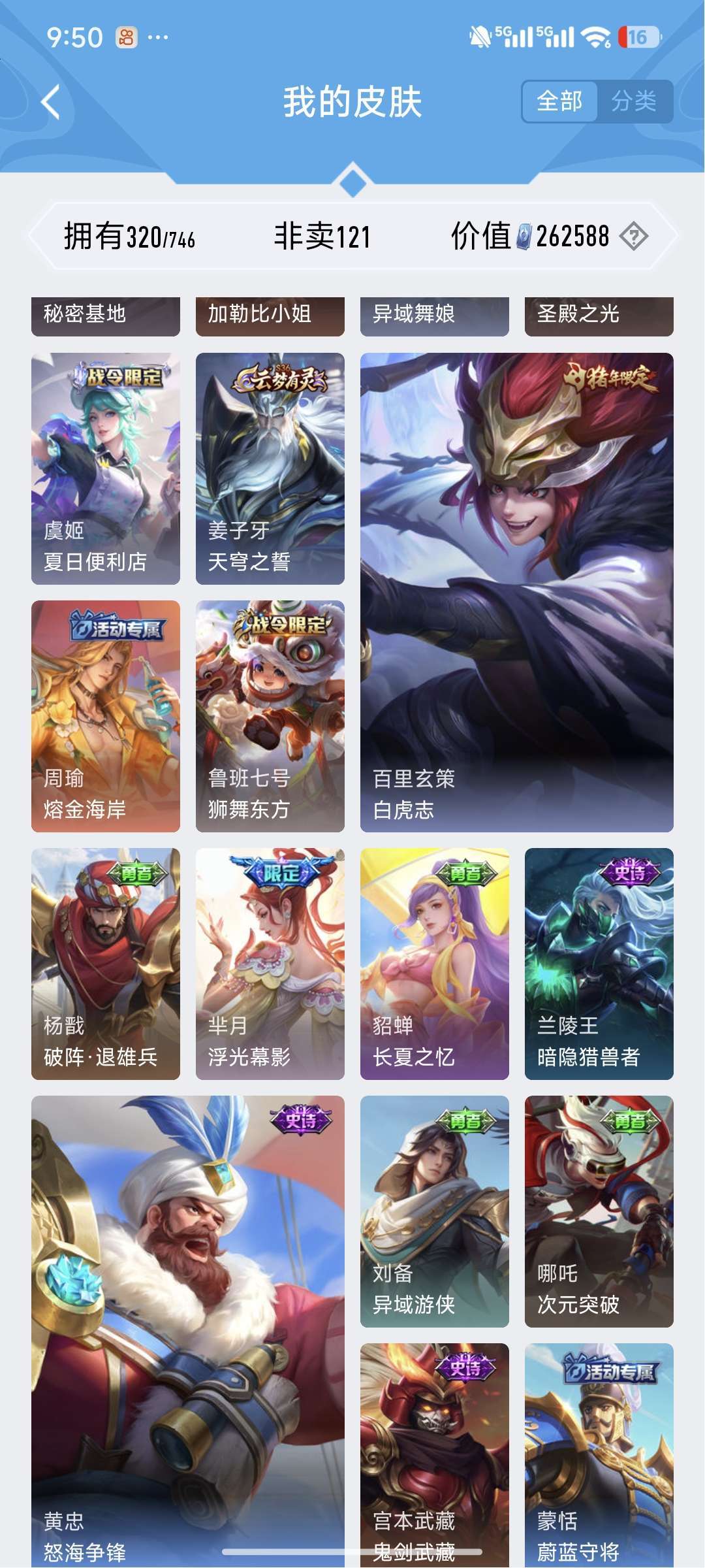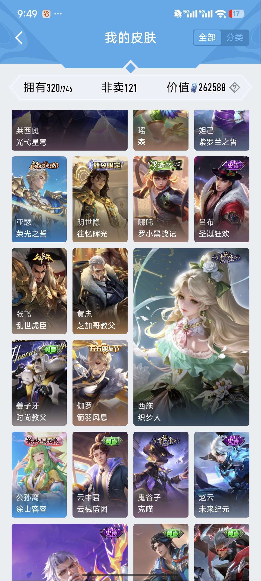 铭文30套,段位目前81星⭐,皮肤数量320个,英雄差个武则天。贵族等级V8