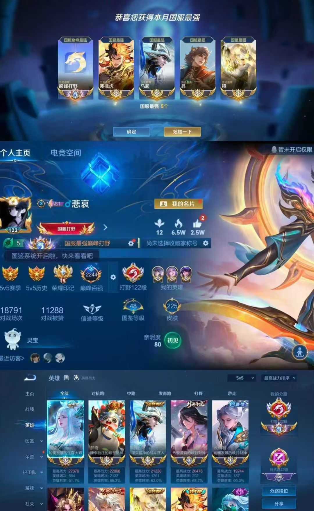 正式服十一月在榜国服裴擒虎 马超 镜 暃❤️122段国服打野❤️2w分露娜 马超 镜❤️巅峰百强⚡框