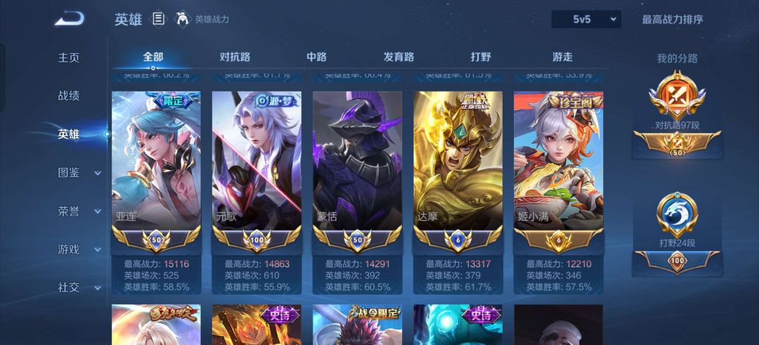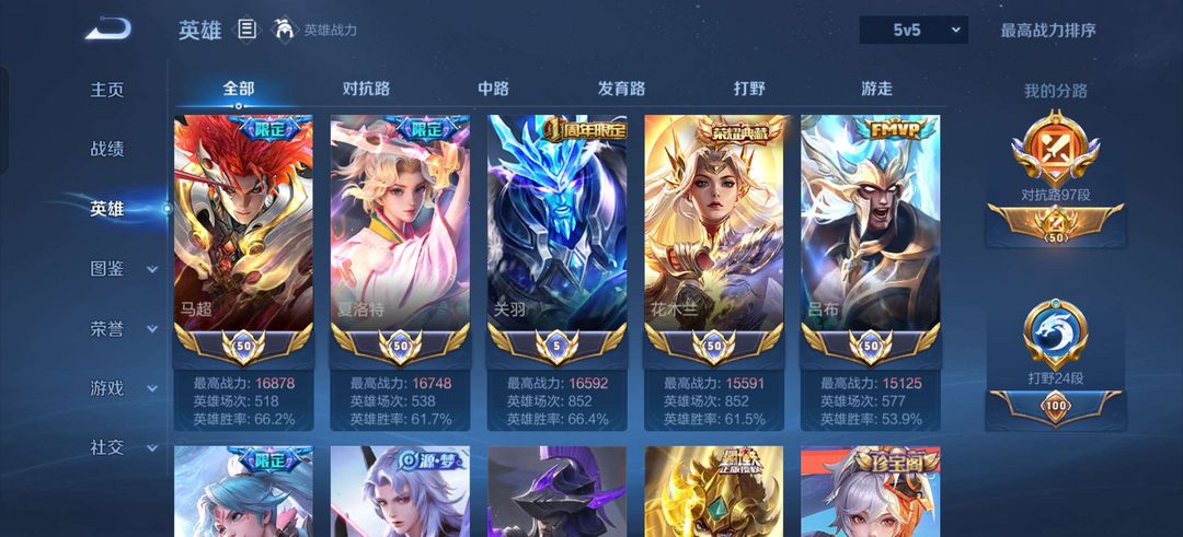 历史国服对抗路97段国服马超+亚连+木兰+元歌+关羽+达摩+吕布等等