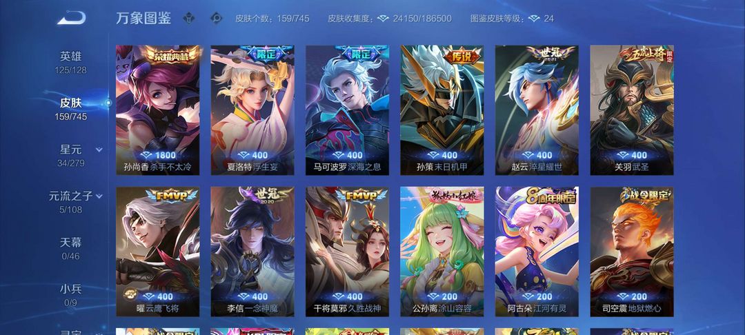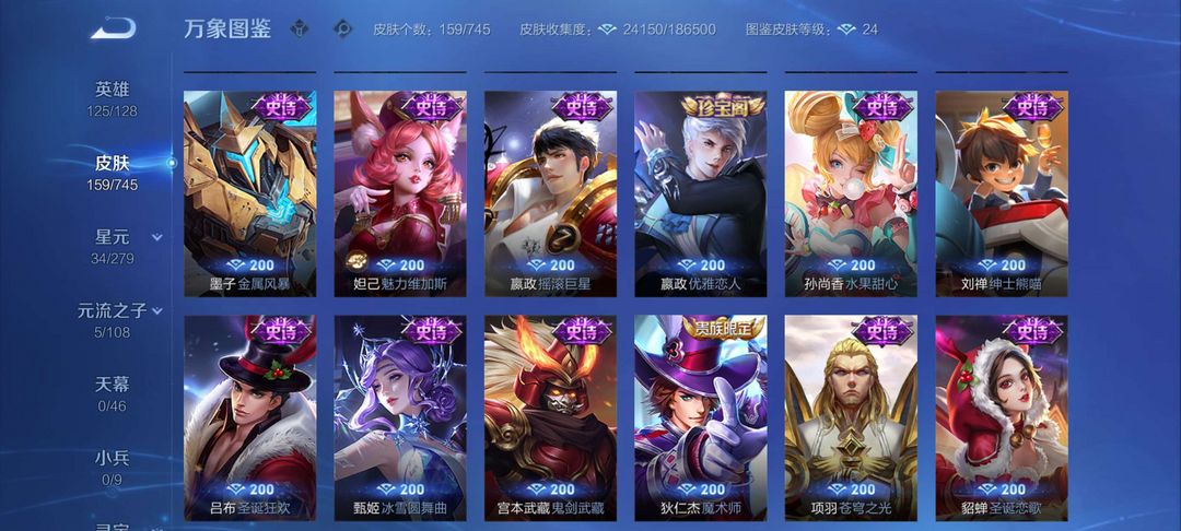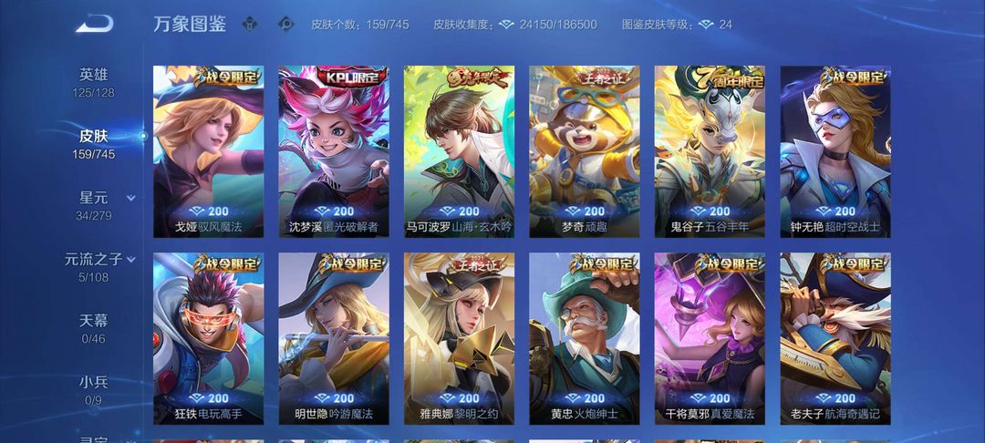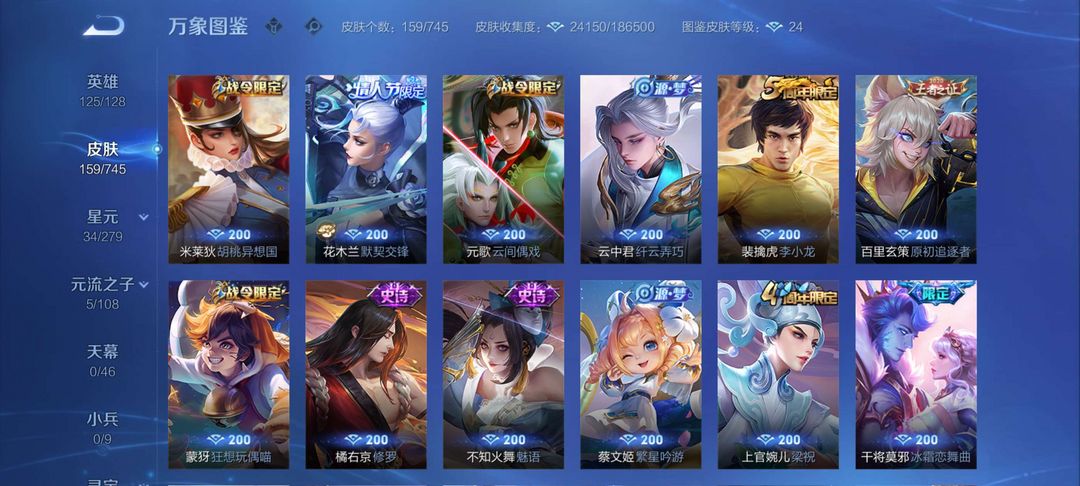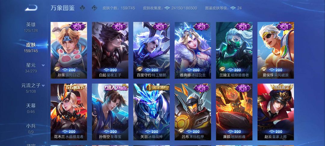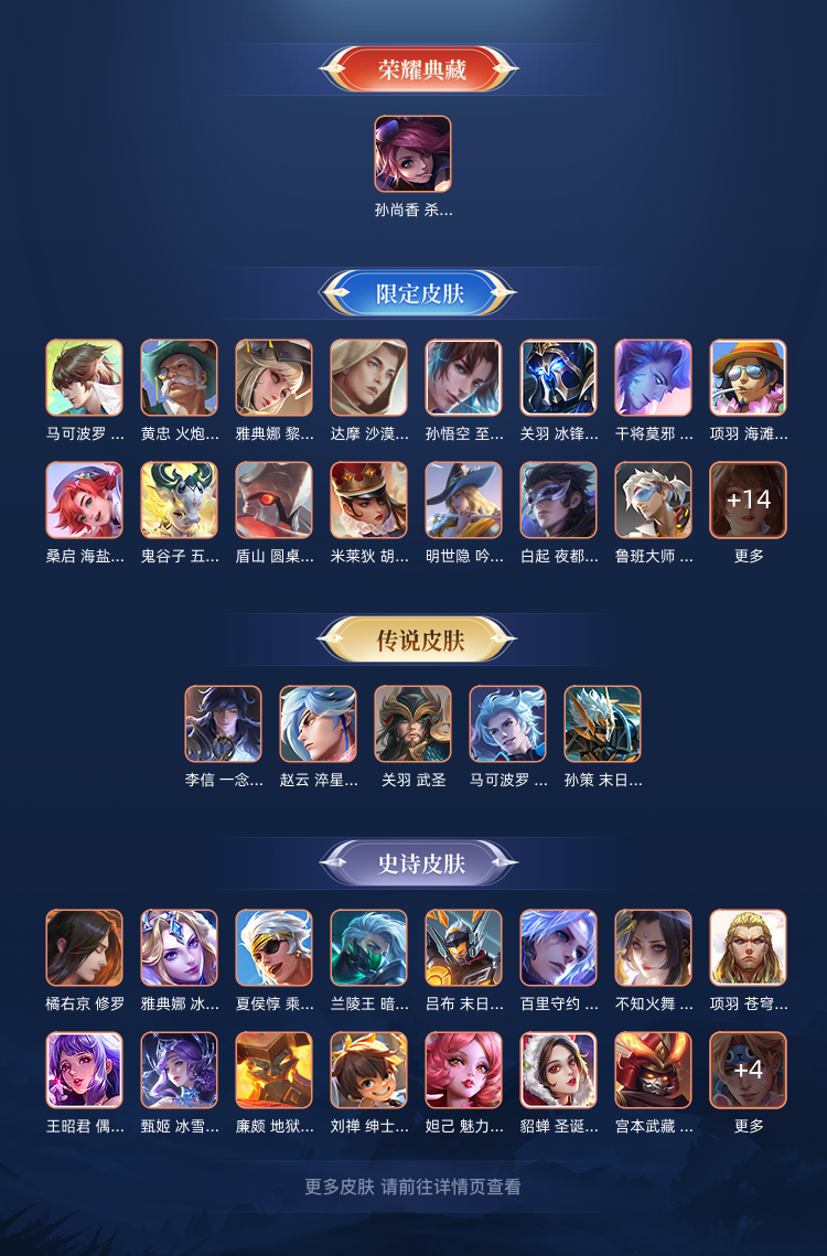 一典藏杀手不太冷,武圣 云鹰飞将 久胜战神 浮生妄 山海玄木吟等多个限定皮肤,铭文满级,现段位铂金