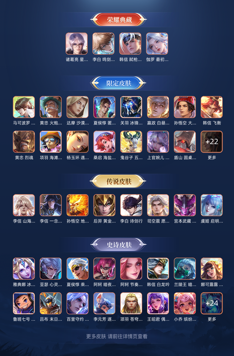 354款皮肤4款荣耀典藏韩信伽罗诸葛亮李白14款传说,108款限定,95史诗,大圣娶亲猴子。
