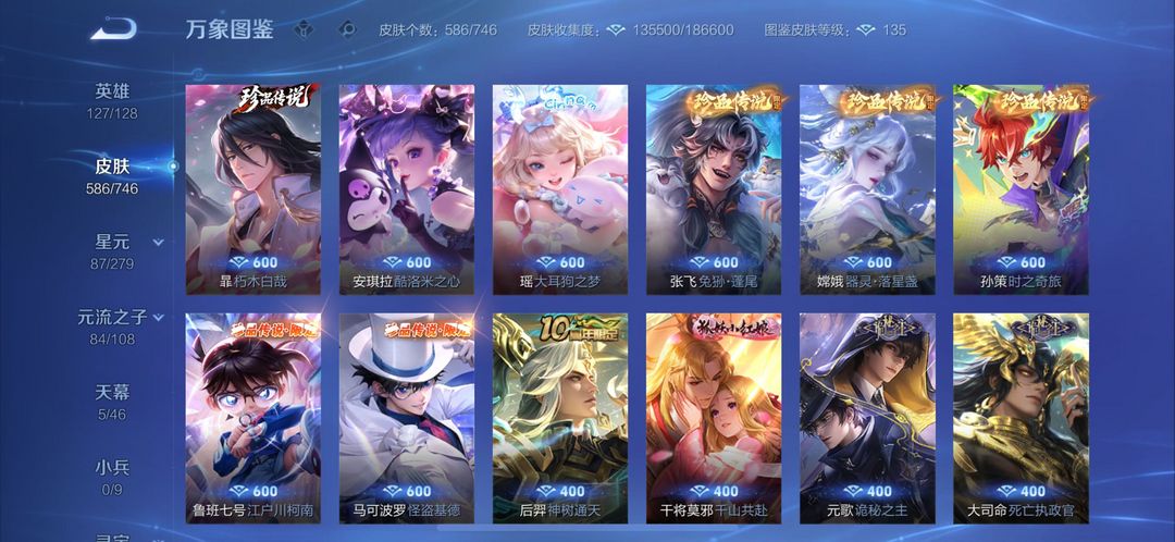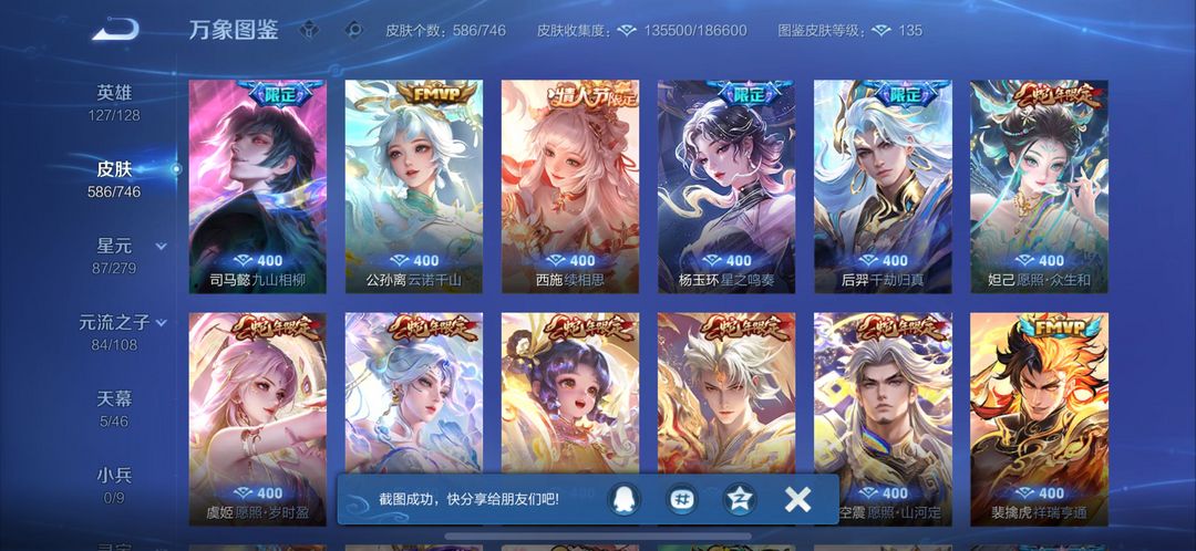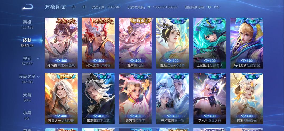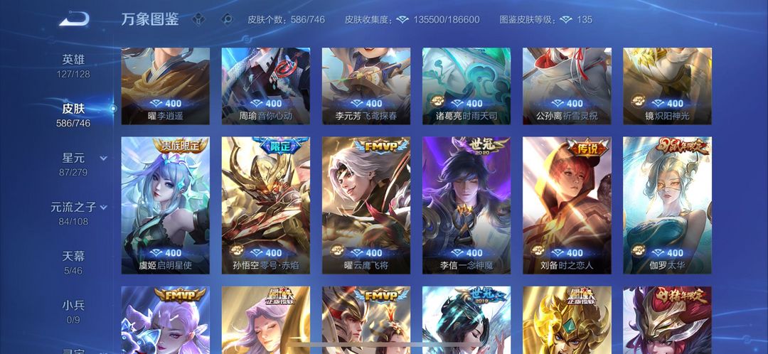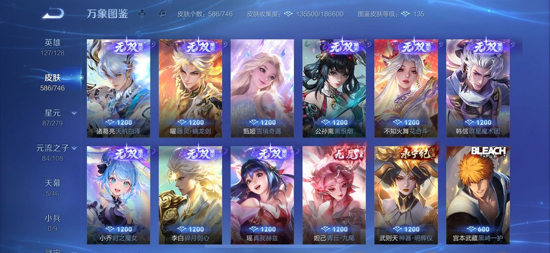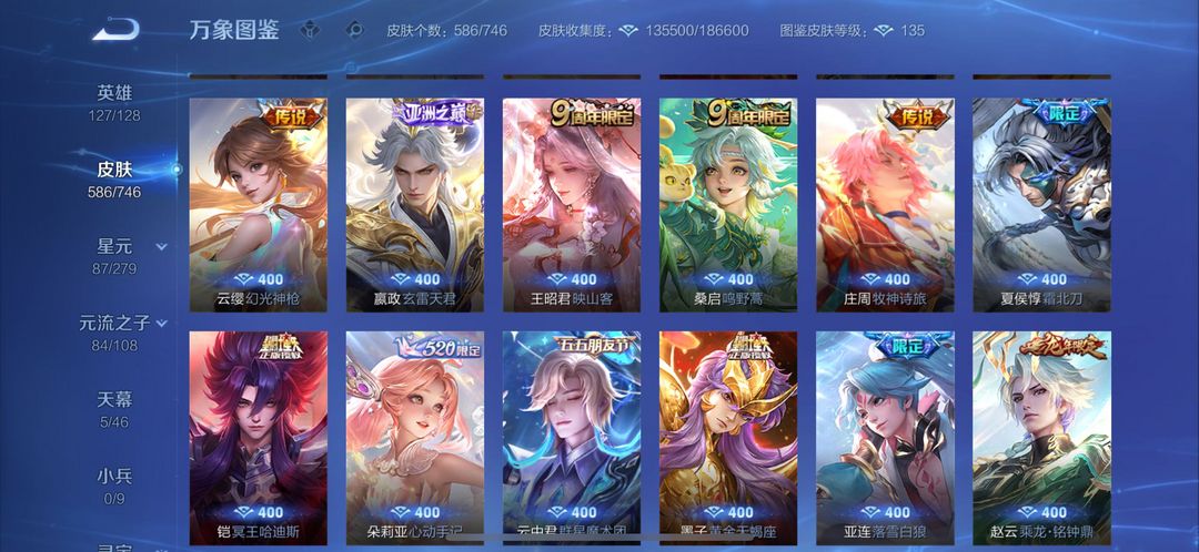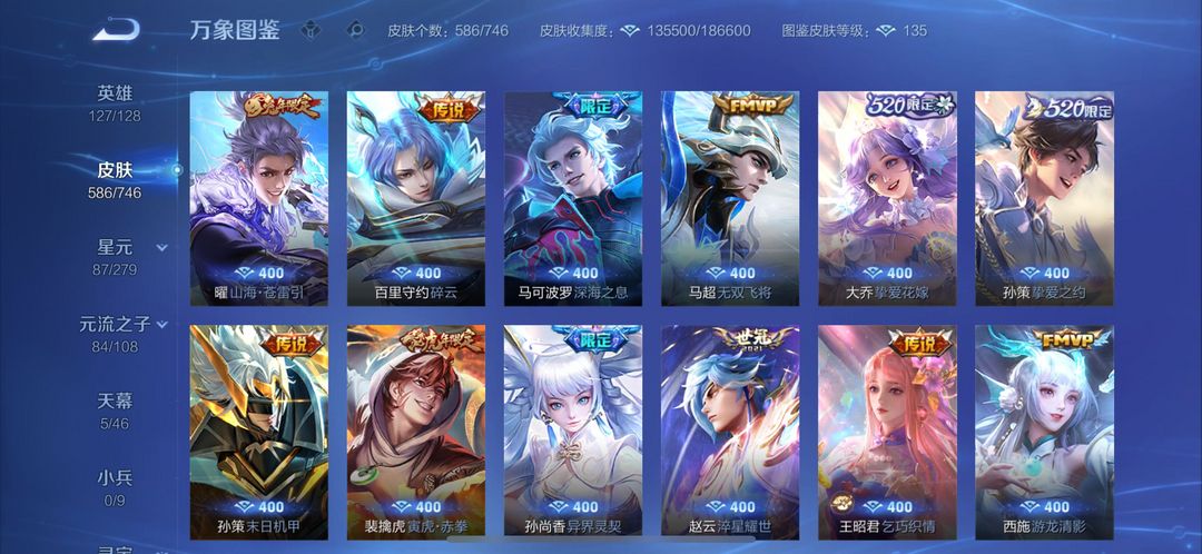 苹果区Q无双贵族极品带妹号587皮肤。10个荣耀水晶,满无双,满珍品,射手皮肤基本全有,帅的也满