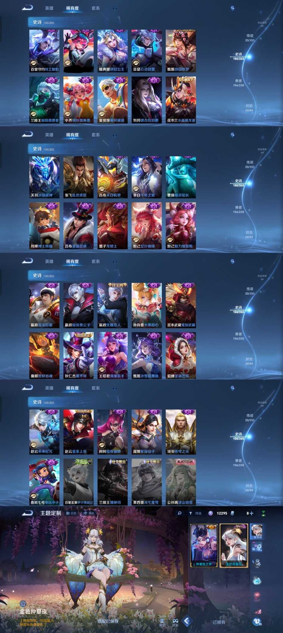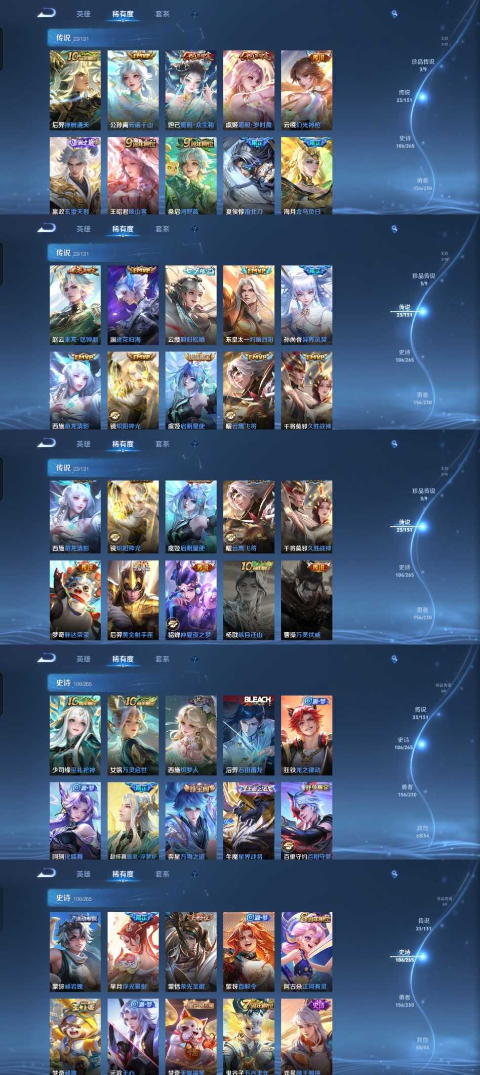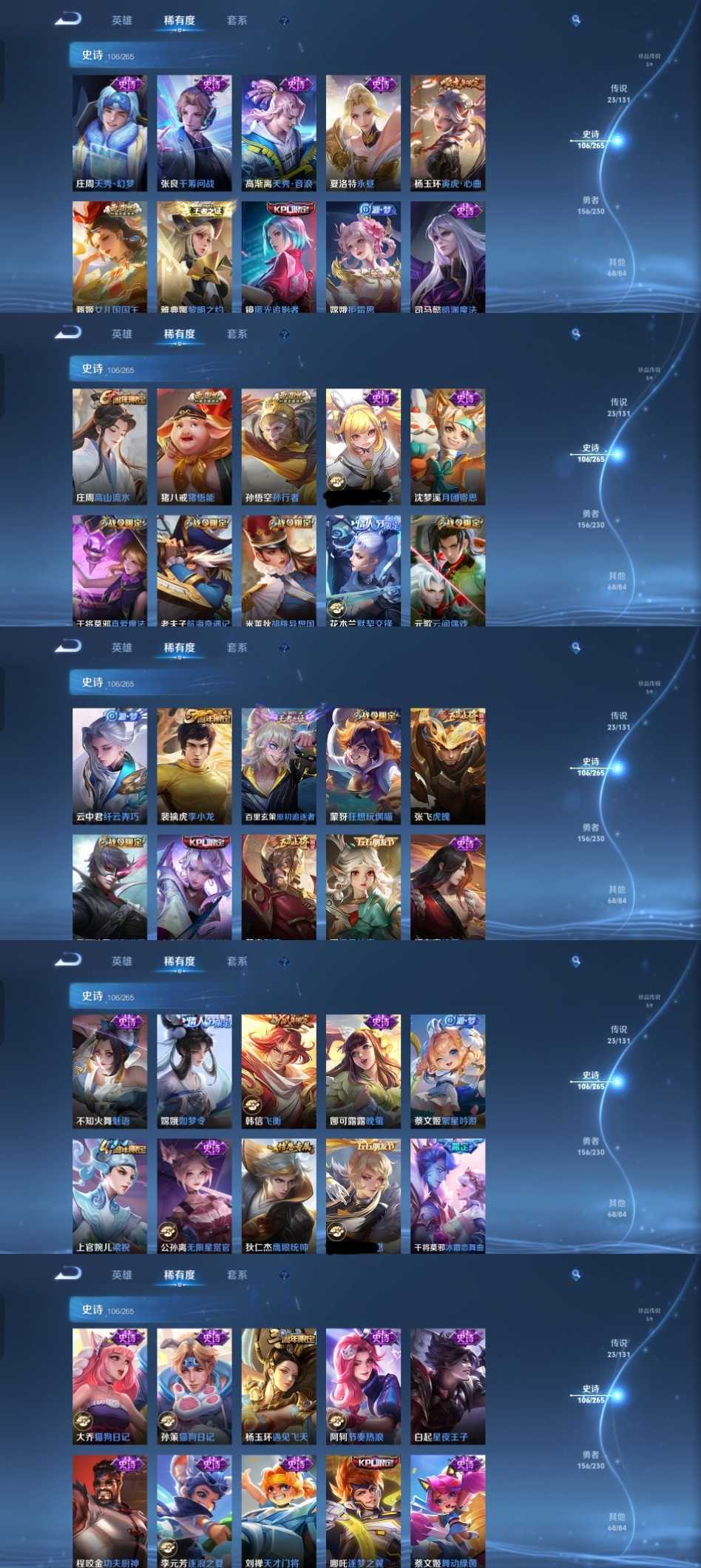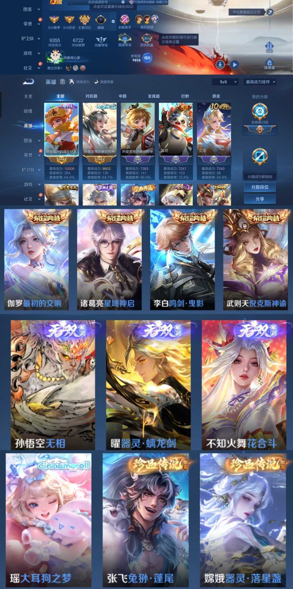 限制: 撤单率<49%才可租用此帐号装备描述:时间到了还登录白玩或者顶号全部改密拉黑处理永不解除,顶号机器会秒禁玩改密,顶号不仅拉黑还没得玩,赚三两块不容易,请理解谢谢。 ❤❤❤❤❤❤❤❤❤❤❤❤❤❤❤❤❤❤❤ 请勿开挂,挂机,送头,骂人,撤单后游戏等如有违规永久拉黑永不解除。 重置二级密码不要费劲了,号主每天都会上号查看,多行不义必自毙,人在做天在看,多做好事多自律,少做缺德事。 该号英雄128个皮肤363个,典藏5个,无双3个,珍品传说3个,星传说1个,传说23个,史诗106个,祝您游戏愉快~