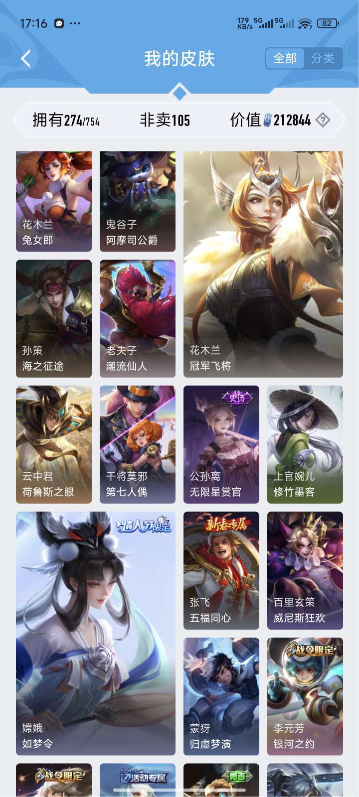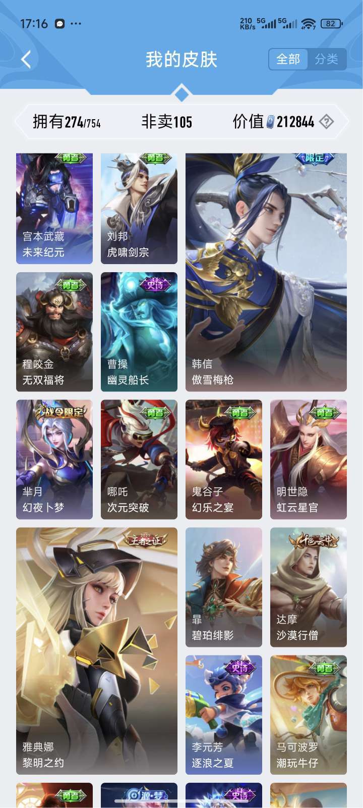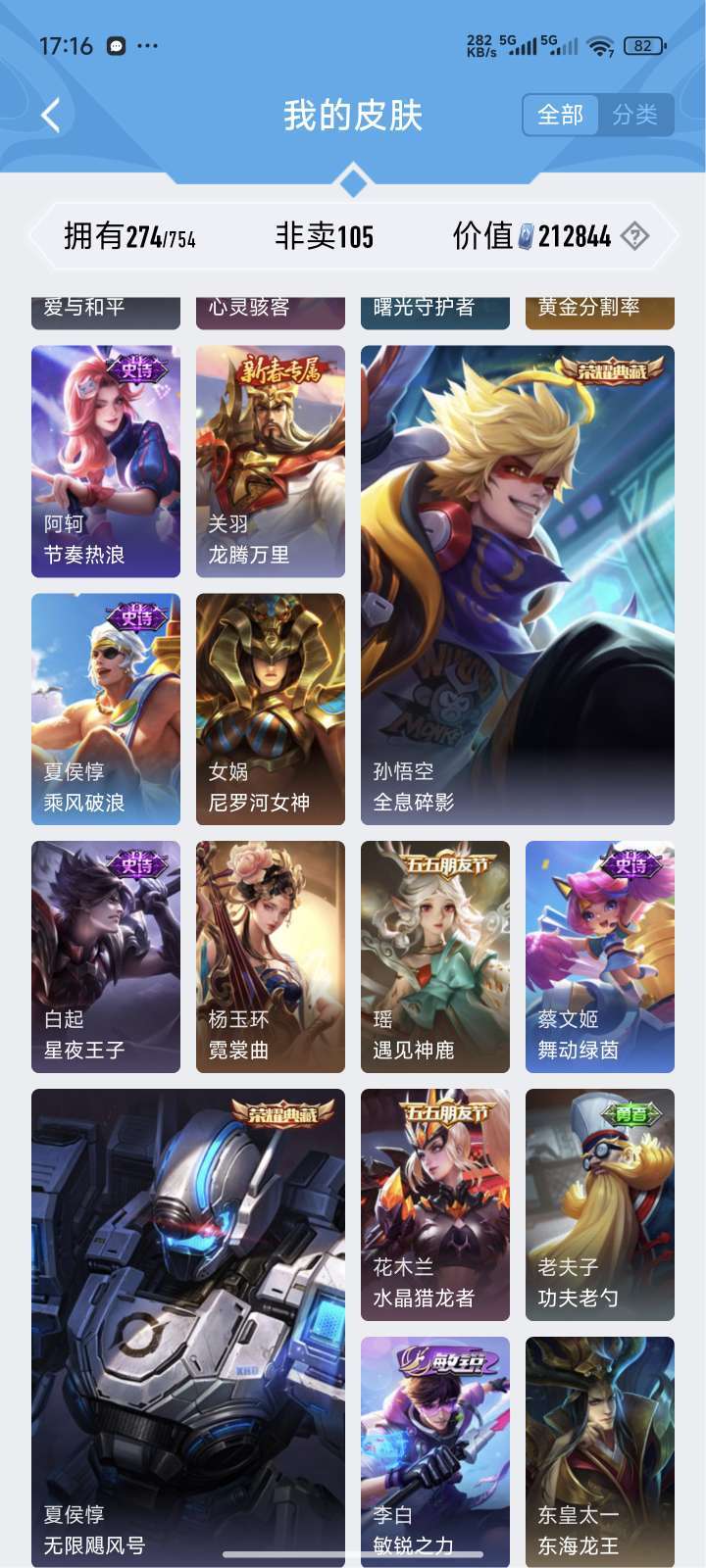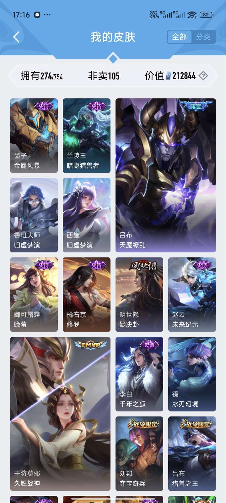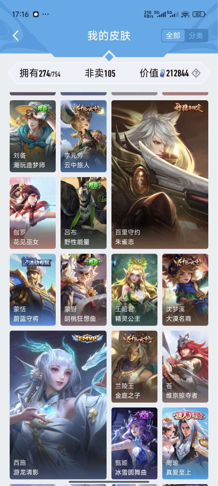 贵族9,热门皮肤基本都有,天魔缭乱,海洋之心,无限飓风号,全息碎影,至尊宝,反正挺多的