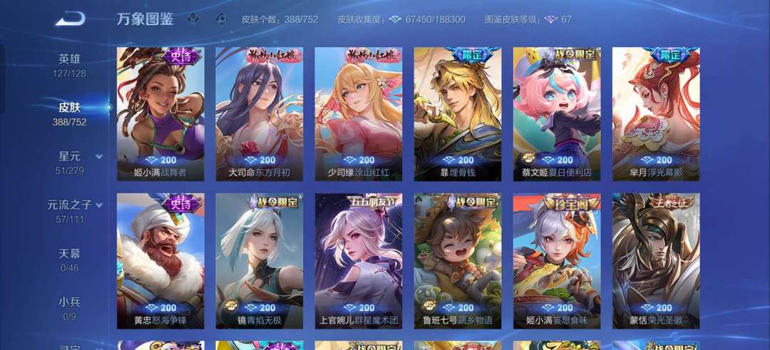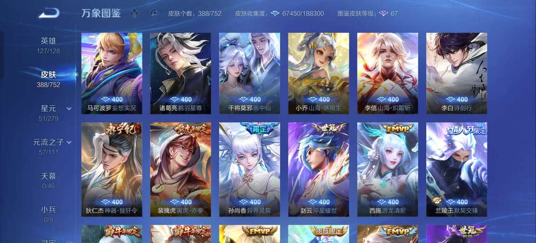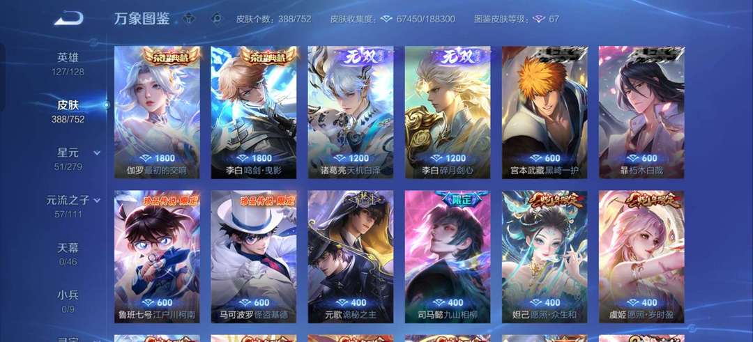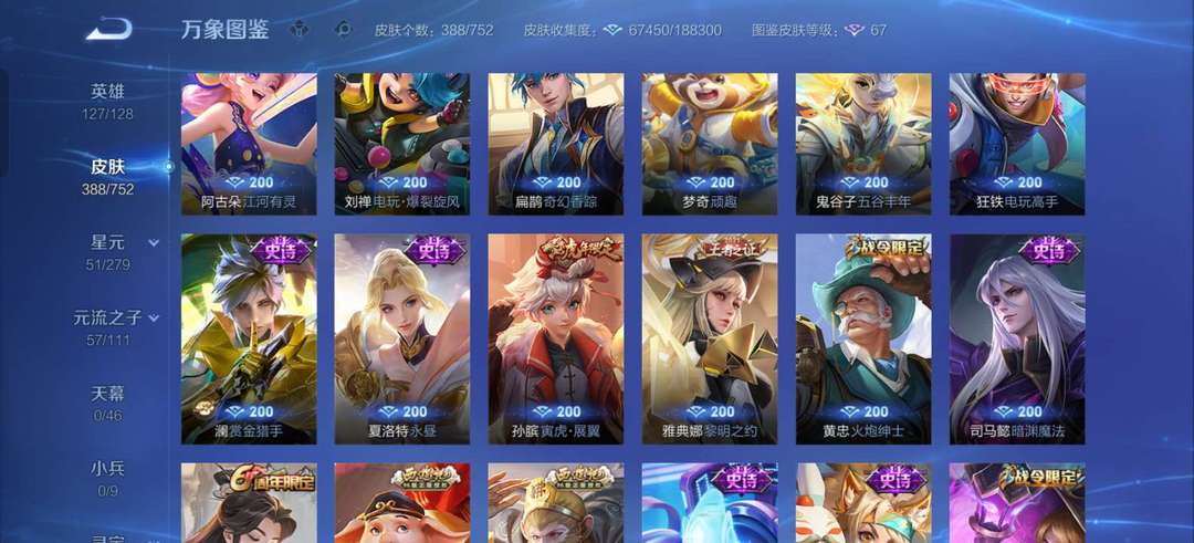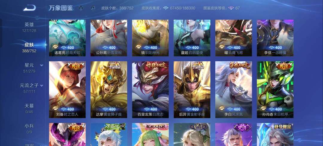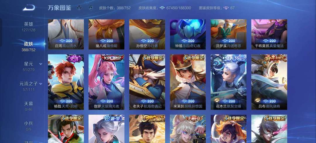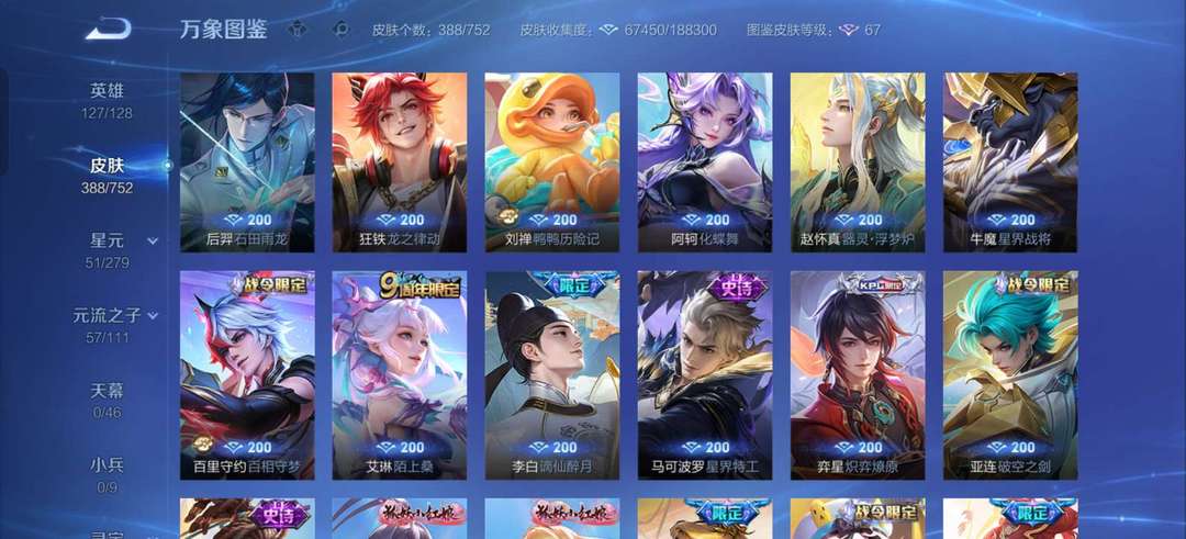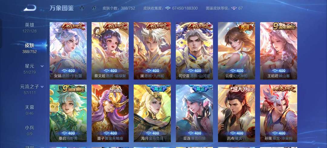 VIP9。388张皮肤大多数传说都有,李白等英雄全皮肤很多,喜欢的可以来了。