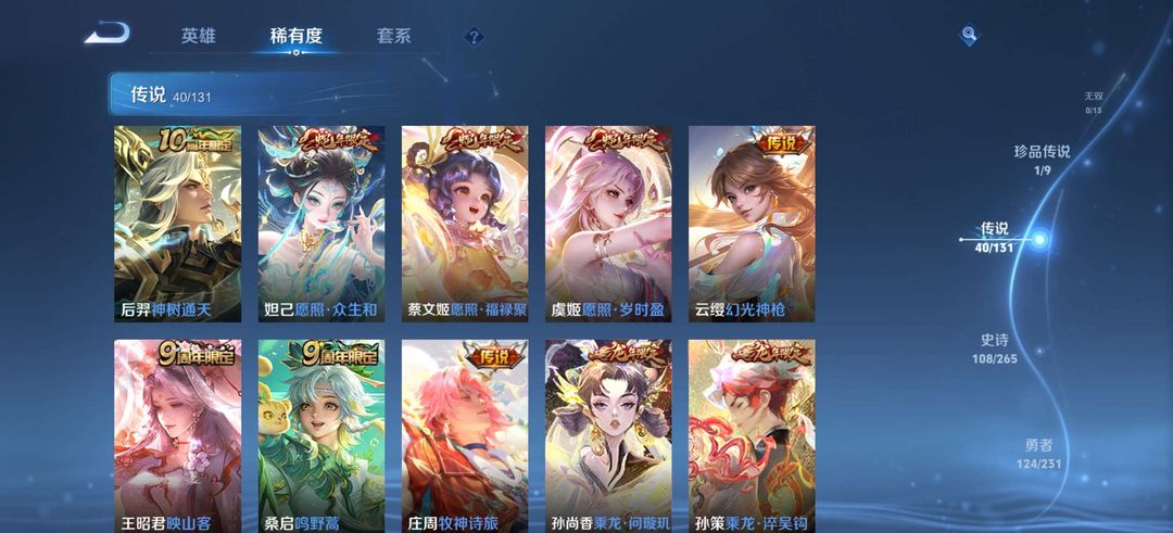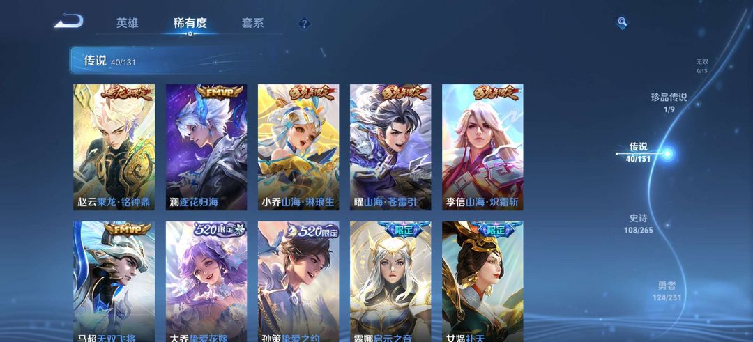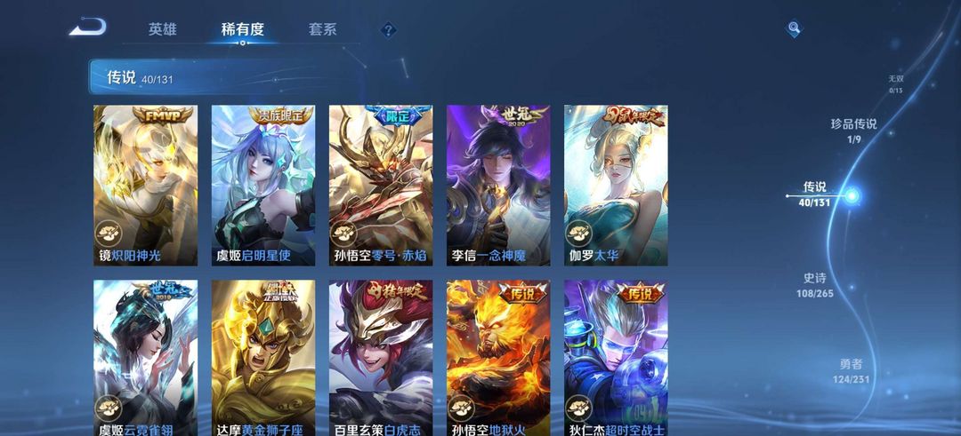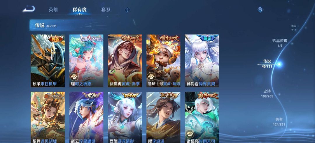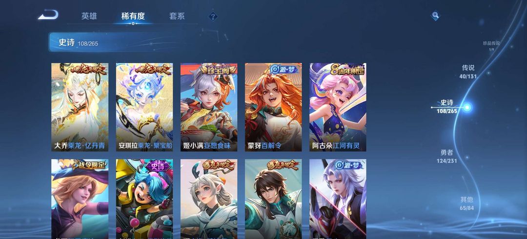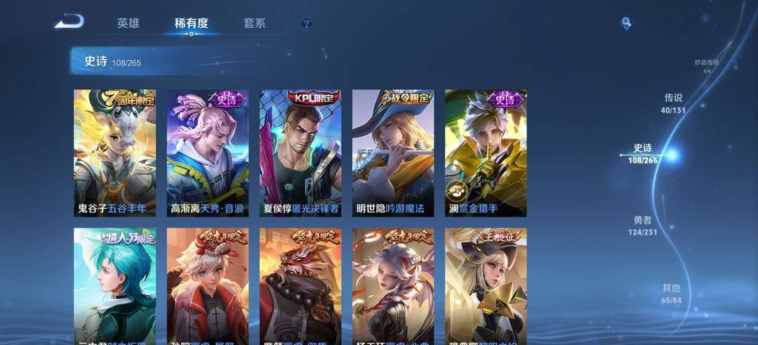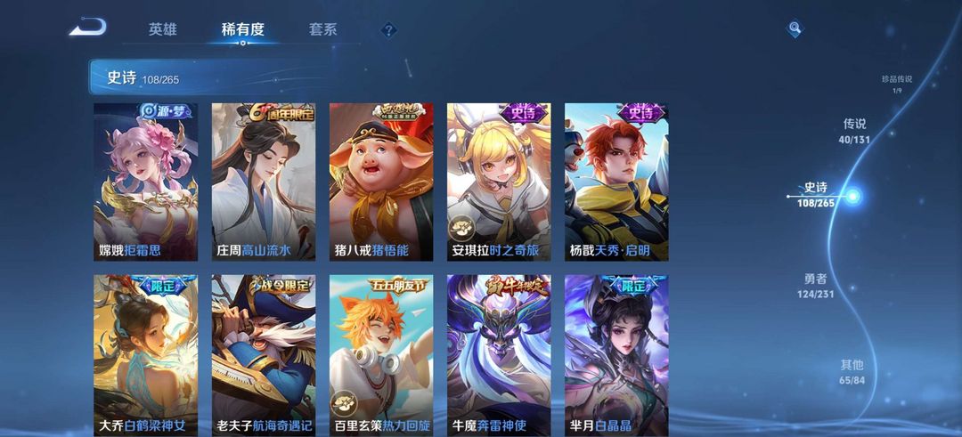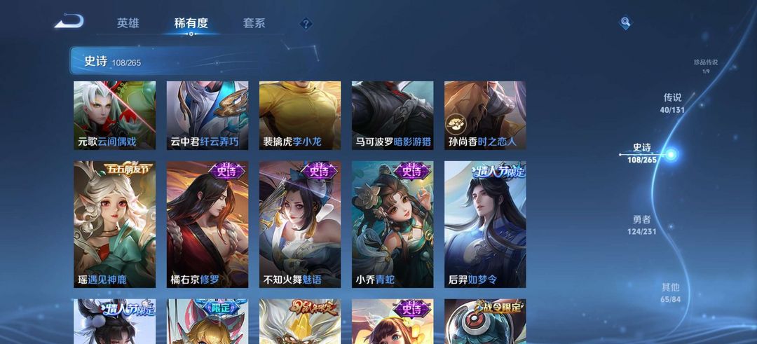 装备描述:龙年虎年鼠年年限都有。40多个传说皮。李白的荣耀典藏。几十个史诗皮有很多都是限定的太华,补天,冰封战神之类的都有。