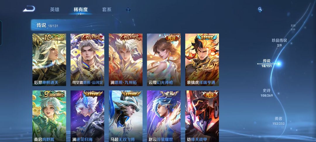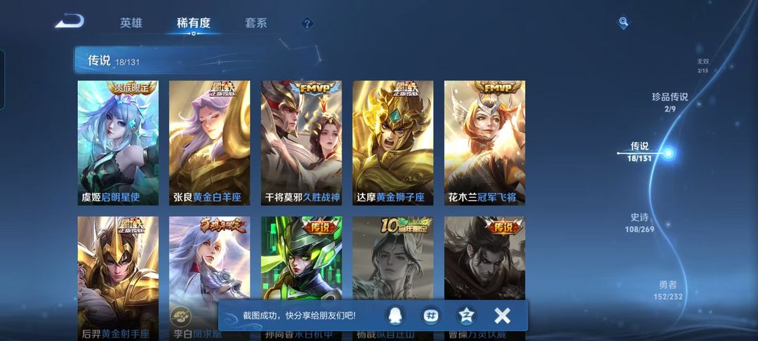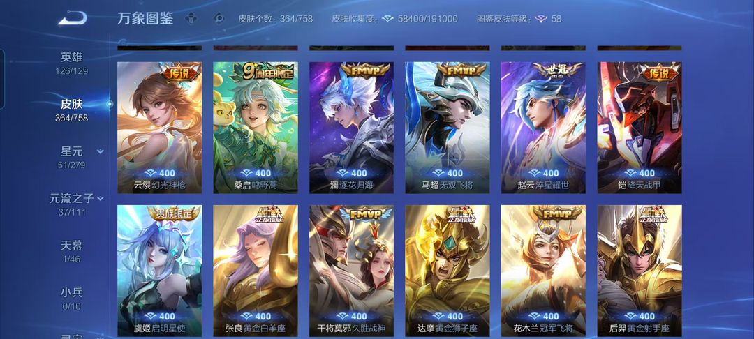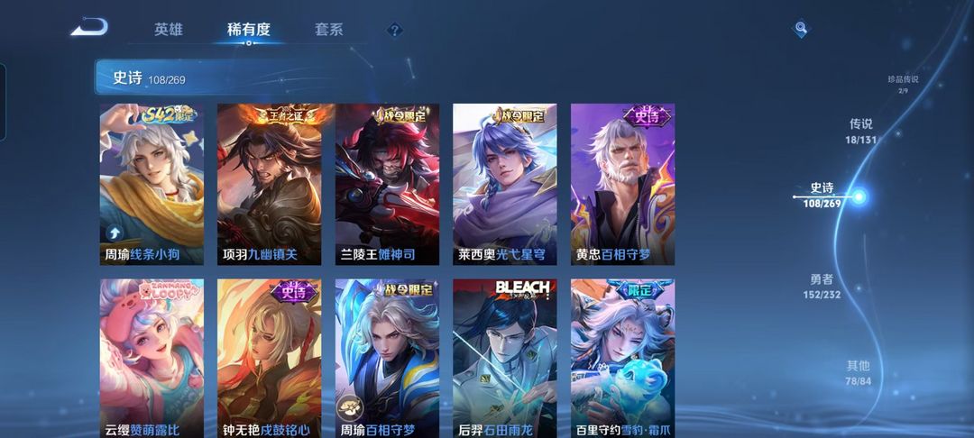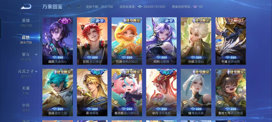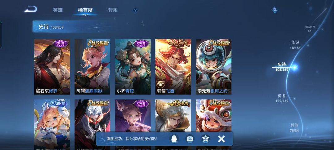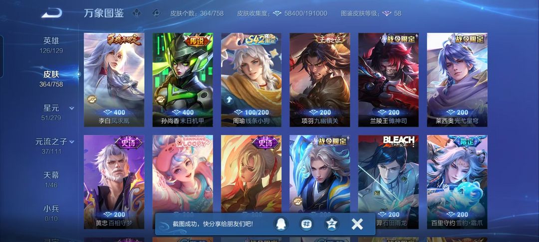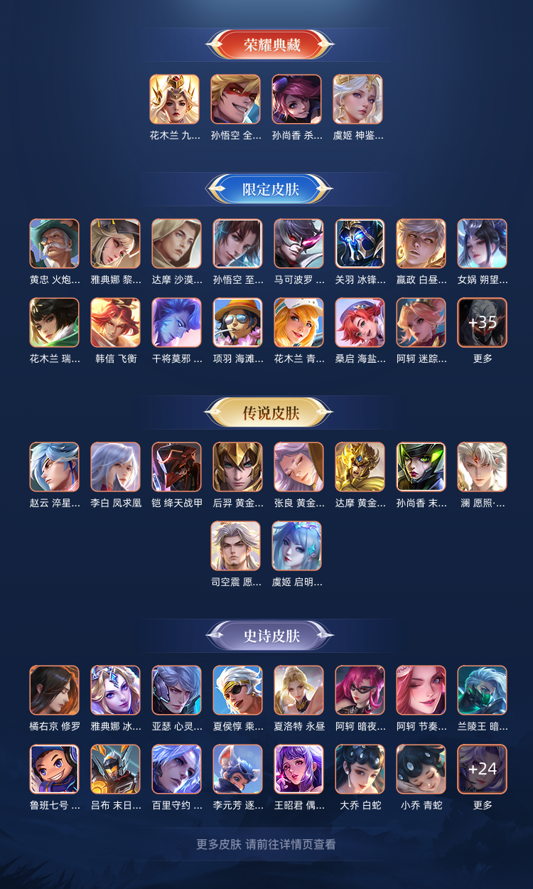 装备描述:V9顶奢号!死神联动双皮+4典藏全拉满!364皮肤! 版本王炸皮肤直接氪满!死神联动双珍品传说——暃·朽木白哉、宫本武藏·黑崎一护,建模特效天花板,手感直接起飞!4款荣耀典藏硬核坐镇:花木兰·九霄神辉、孙尚香·杀手不太冷、孙悟空·全息碎影、虞姬·神鉴启示录,典藏排面直接拉满!还有诸葛亮·天机白泽、韩信·群星魔术团2款稀有无双皮肤,特效炸裂辨识度拉满! 限定+史诗+传说堆成山!18款传说、106款史诗、132款限定全覆盖!凤求凰、至尊宝、冰锋战神、白鹤梁神女等老牌情怀限定全收录;后羿·神树通天、澜·愿照九州拓等新款限定一键解锁!更有嬴政·优雅恋人、艾琳·女武神、孙尚香·蔷薇恋人3款内测绝版皮肤,收藏党狂喜! 全英雄阵容+稀有英雄集结!126位英雄集齐,韩信、艾琳、夏洛特、不知火舞等9款稀有英雄全到手,打野/对抗/法师/射手热门位置皮肤库爆满!韩信群星魔术团+傲雪梅枪+飞衡、澜逐花归海+年限、花木兰九霄神辉+瑞麟志+冠军飞将,想玩啥直接选!