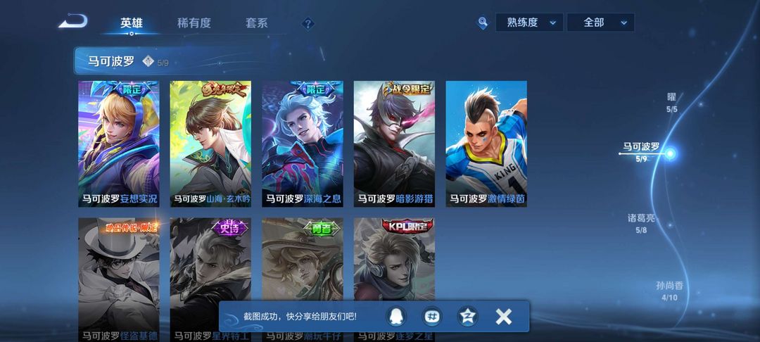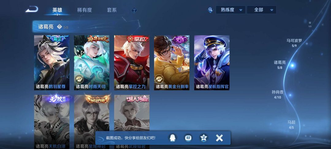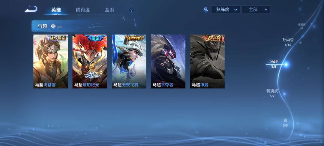 装备描述:曜,露露全皮,马超几乎全皮,公孙离年限,李白鸣曳剑影等等