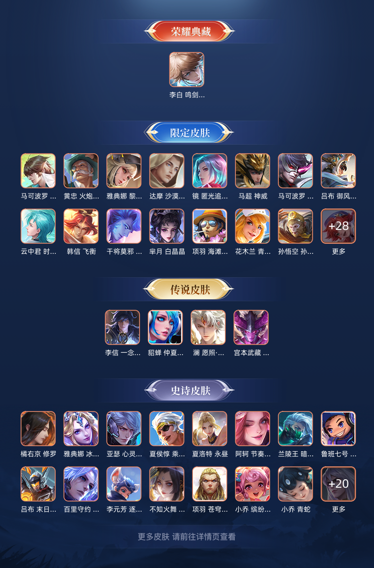250+高质量皮肤●李白荣耀典藏●马超神威●裴擒虎虎年限定●澜蛇年限定●还有一系列限定皮肤