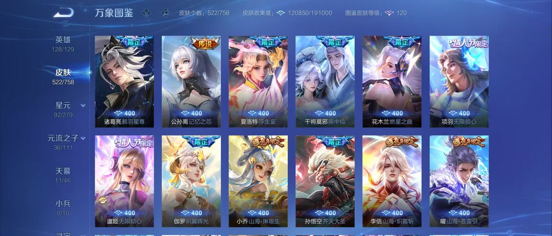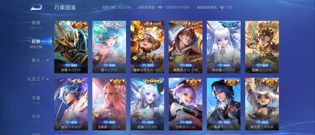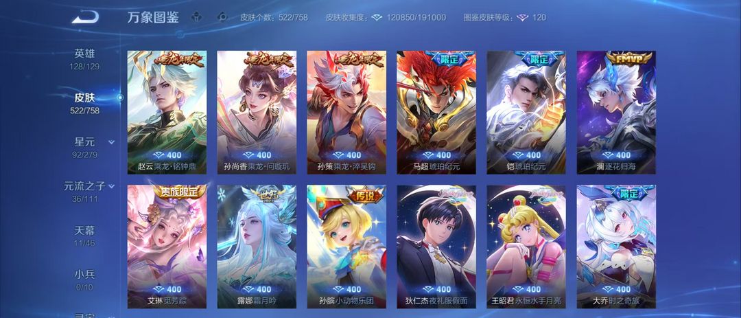 贵10 -V10满荣耀水晶(缺瑶妹伽罗吕布)9星元3无双520皮、小乔李白武则天无双、龙年套、