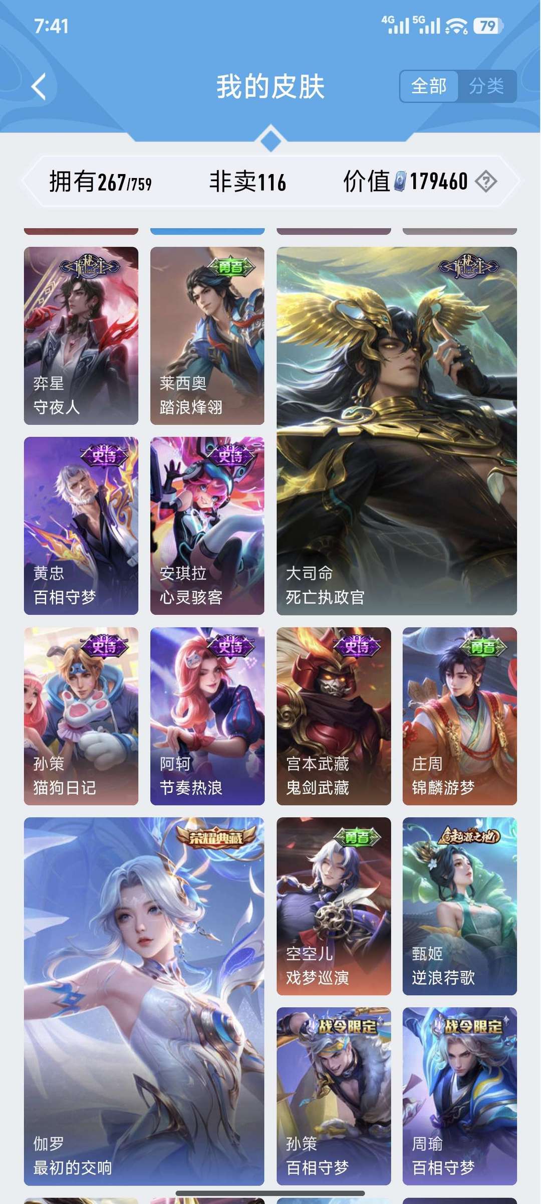 永耀之星•引擎之心•伽罗典藏•李信全皮•死亡执政官•久胜战神•黄金狮子座等等超多皮肤
