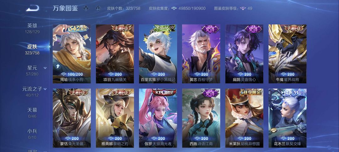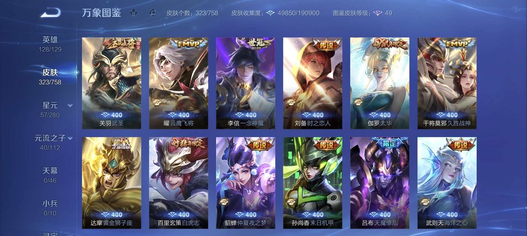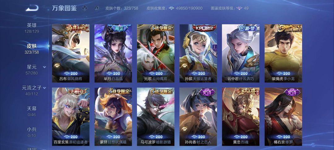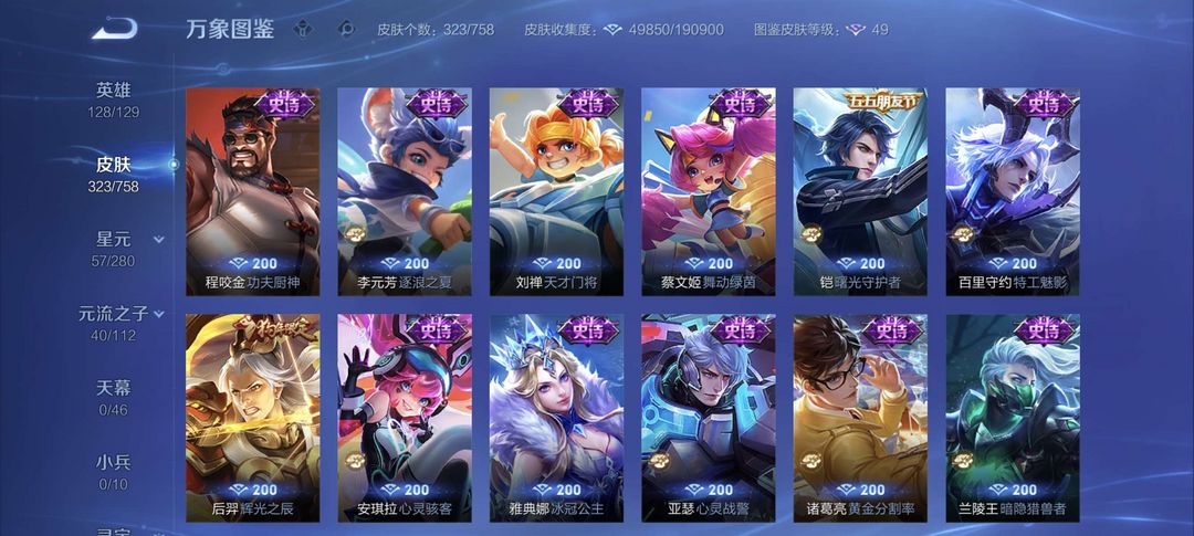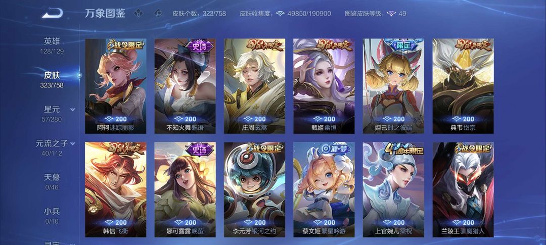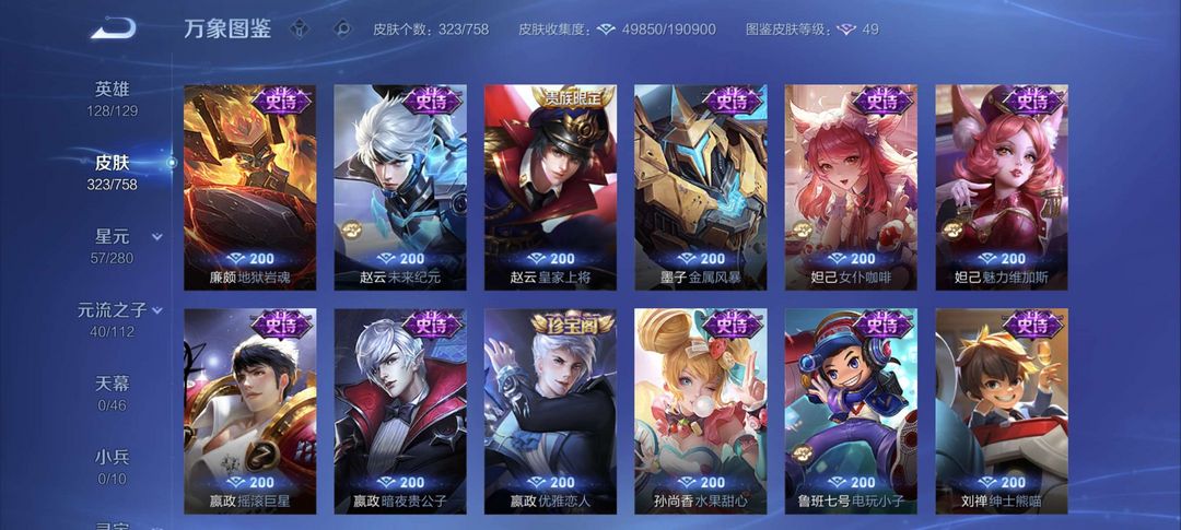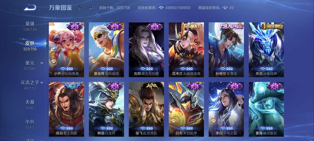 装备描述:超多传说 限定皮肤 128个英雄 323个皮肤 小姐姐号噢