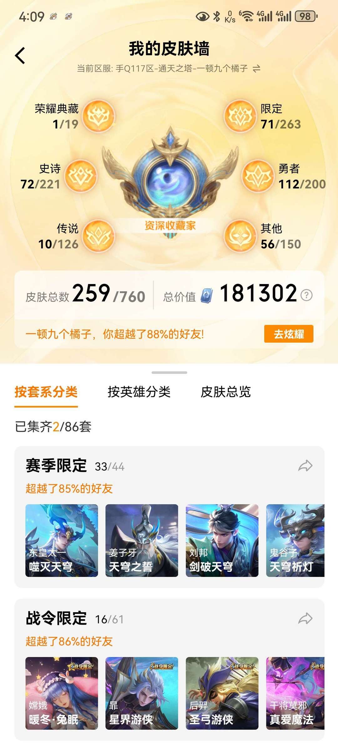 装备描述:259皮肤,可排位,主玩木兰,木兰荣耀典藏木兰差一全皮