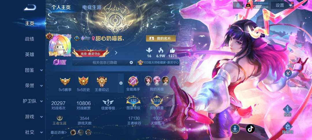 禁巅峰禁改主页和名字,精品女号全英雄,李信无双,全马限,瑶全皮,尼克斯神谕,怪盗基德,露比天幕和小兵