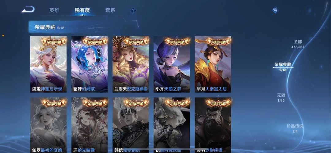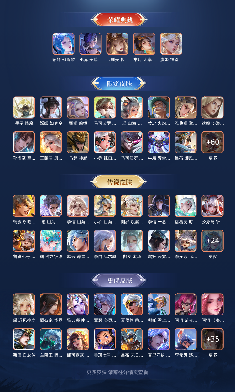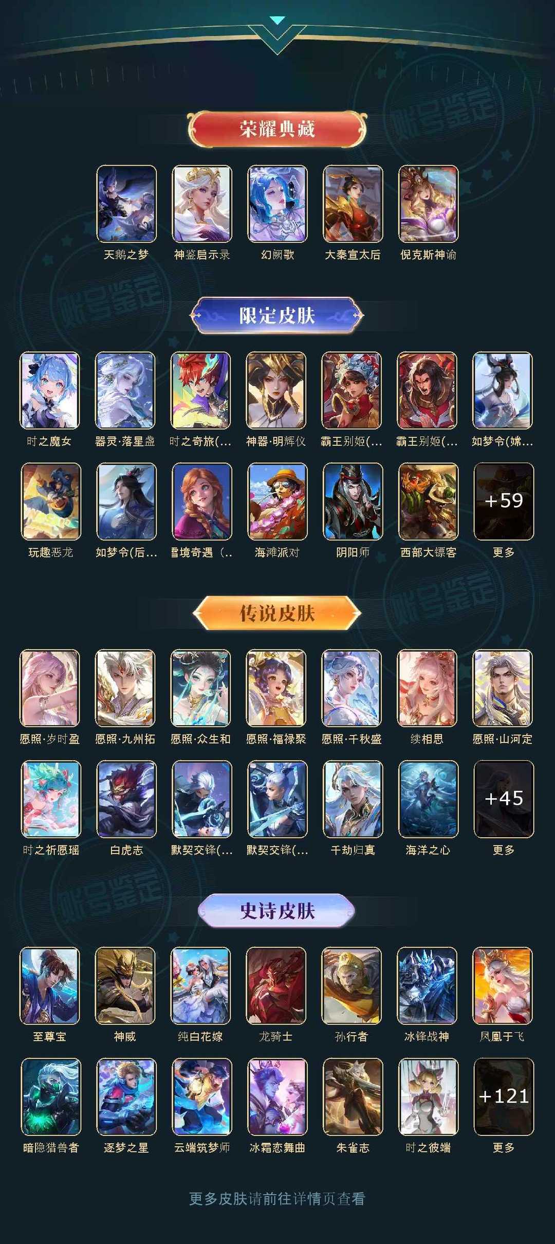 装备描述:贵族等级V10,英雄数量123,典藏皮肤数5,皮肤数量436,纯白花嫁/至尊宝/白虎志/朱雀志/久胜战神/愿照·九州拓/愿照·众生和/神器·明辉仪/神鉴启示录/愿照·福禄聚/时之祈愿瑶/器灵·落星盏/幻阙歌/时之奇旅(孙策)/愿照·千秋盛/雪境奇遇(甄姬)/愿照·岁时盈/续相思/神威/愿照·山河定/时之魔女/时雨天司/纯白花嫁/至尊宝/白虎志/朱雀志/久胜战神/愿照·九州拓/愿照·众生和/神器·明辉仪/神鉴启示录/愿照·福禄聚/时之祈愿瑶/器灵·落星盏/幻阙歌/时之奇旅(孙策)/愿照·千秋盛/雪境奇遇(甄姬)/愿照·岁时盈/续相思/神威/愿照·山河定/时之魔女/时雨天司